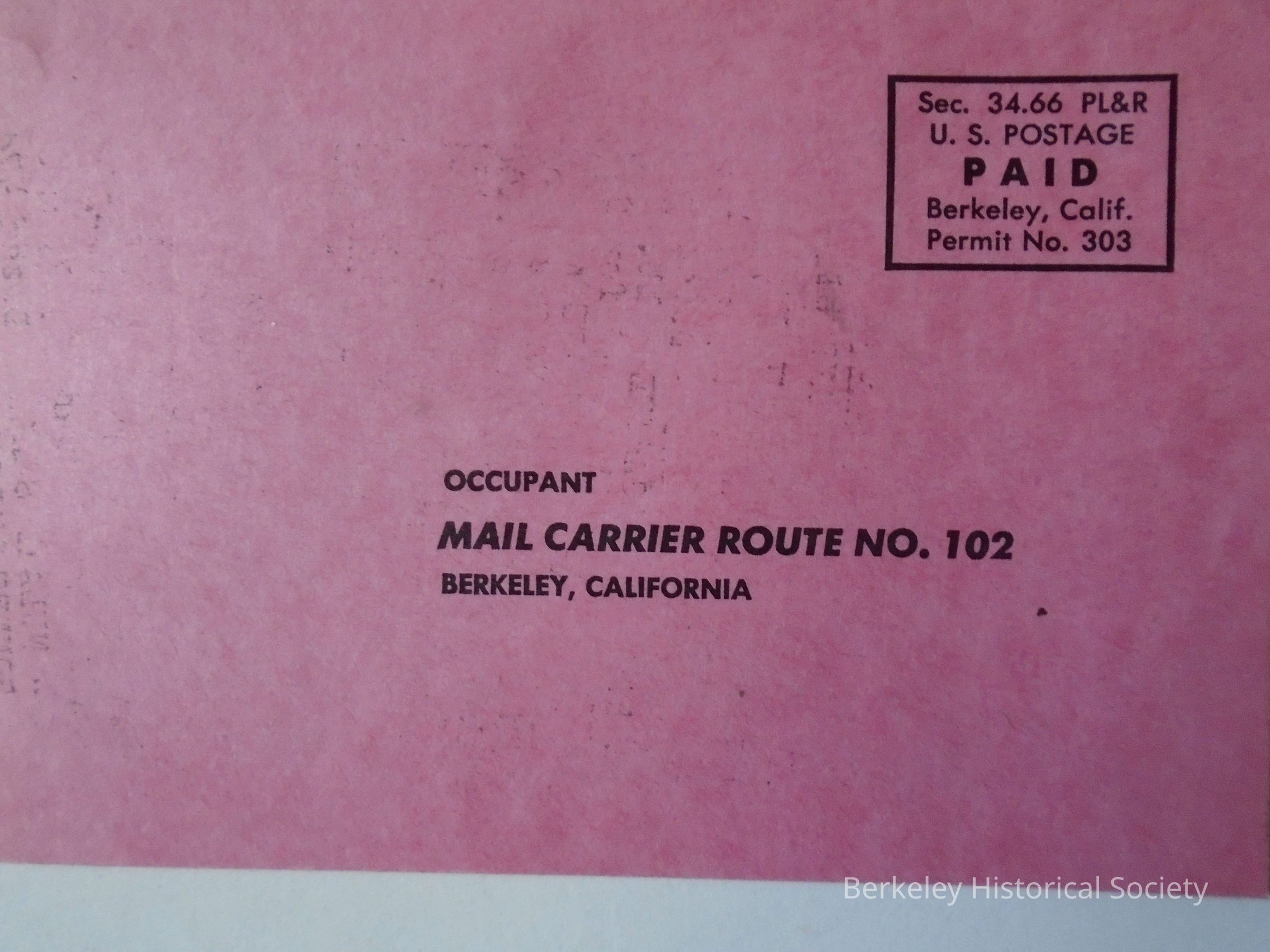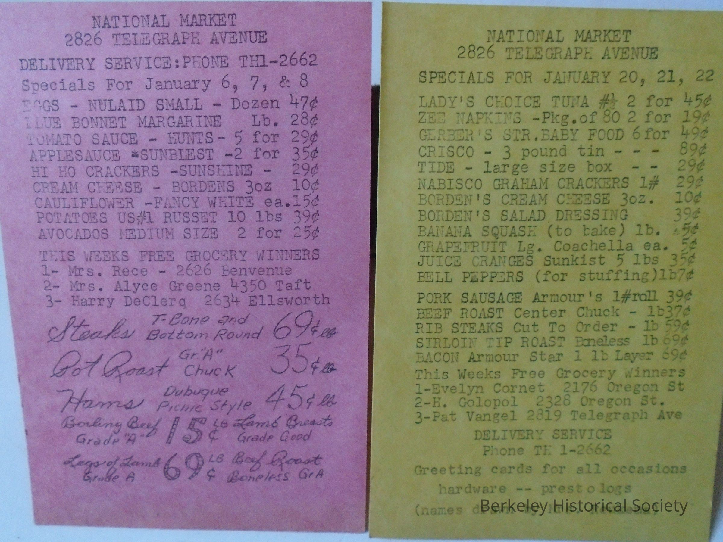 Paper advertising cards (2) for National Market, 2826 Telegraph Ave. Postcards for mailing, postcard postage, addressed: Occupant, Mail carrier route no. 102, Berkeley, California. Lists food specials for Jan 20,21,22 and Jan 6,7,8 plus "free grocery winners".