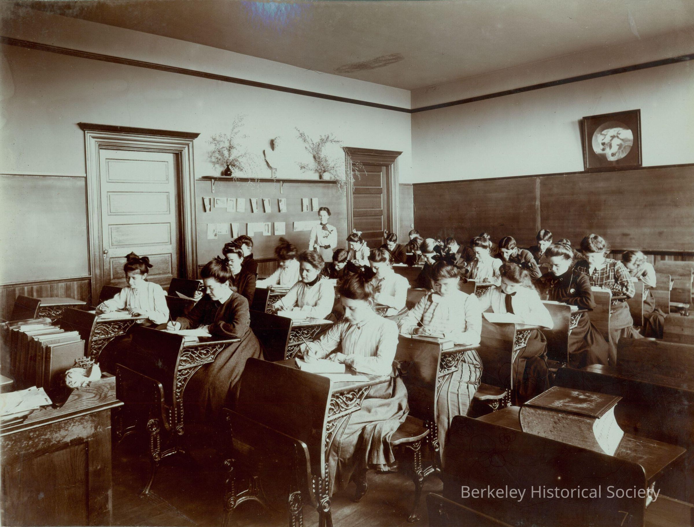 Students, mostly women, writing at desks; teacher standing in background.Made/Created