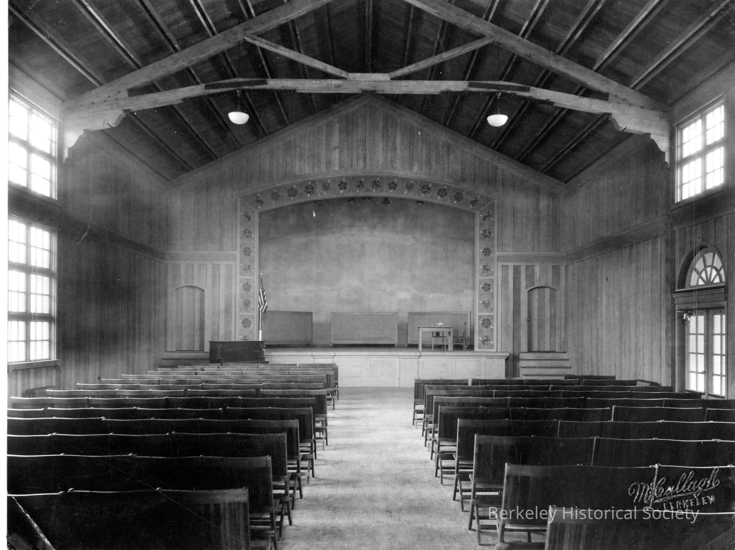 The school auditorium from the back toward the stage, rows of chairs in foreground.
