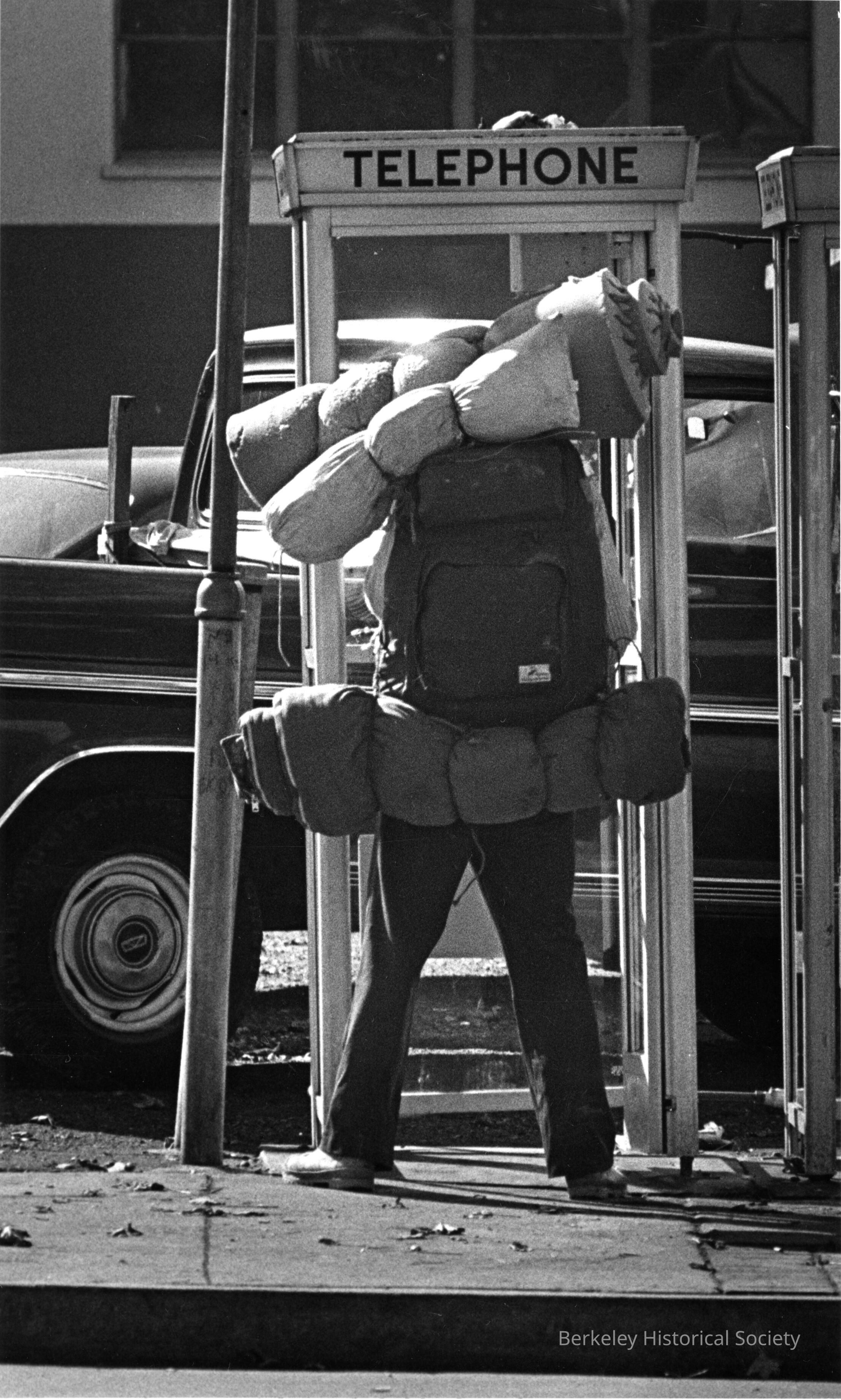 Man carrying large rolled sleeping bags that won't fit into telephone booth; view from back. Photo taken at 10th and University.Other Names and Numbers