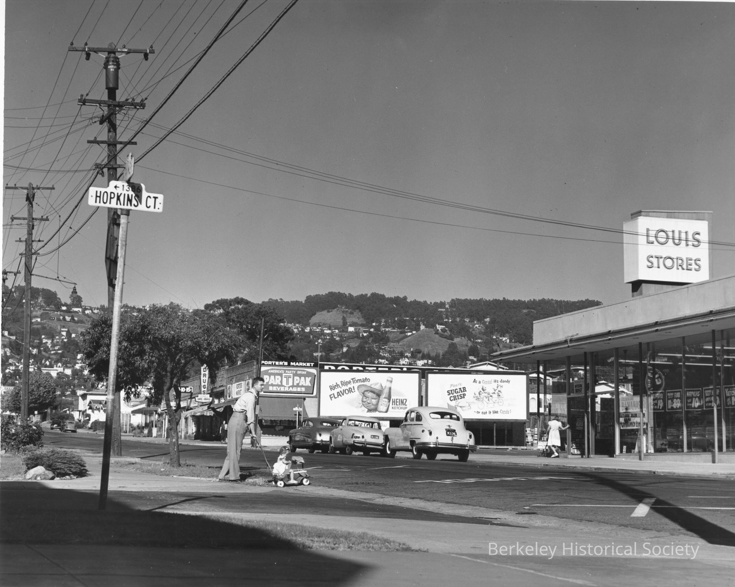 Hopkins street looking east from corner of Hopkins Court. Visible are Louis Stores and Porters Market. Man pushing child about to cross street