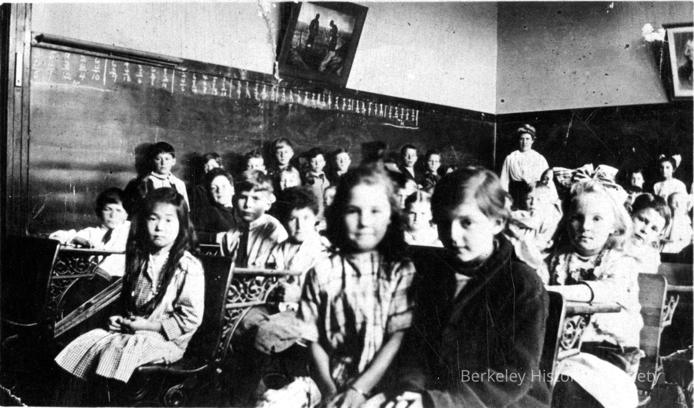 Children at desks; teacher standing in far corner of room. Addition problems on blackboard.