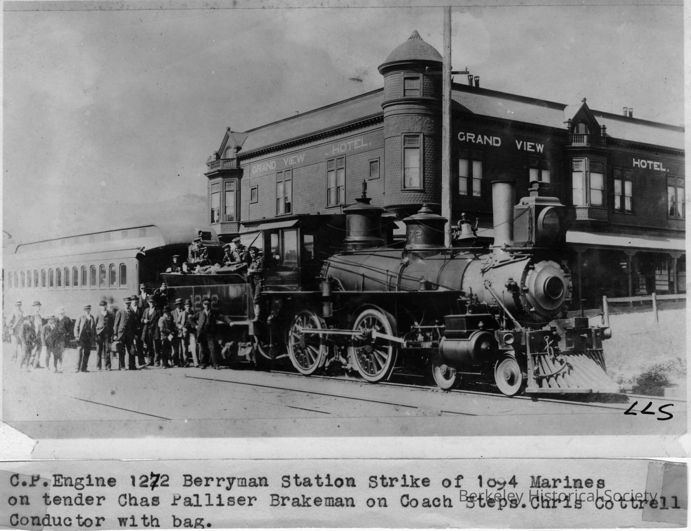 image with different notes "CP Engine 1272 Berryman Station Strike of 1894 Marines on tender Chas Palliser Brakeman on Coach Steps. Chris Cottrell Conductor with bag."