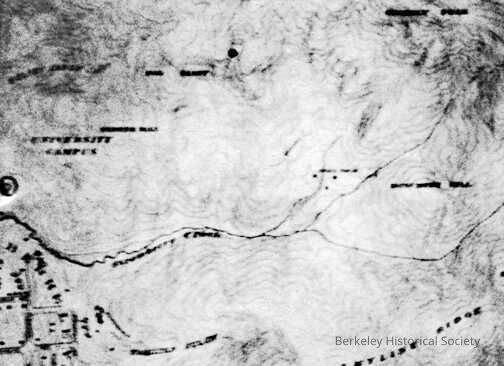 A print of a contour map of northern UC area. Department of Geography. Map shows Piedmont Way, College and Bancroft. Strawbery Creek, Monument Hill, Serene Hill, Little Grizzley, Pie Knob