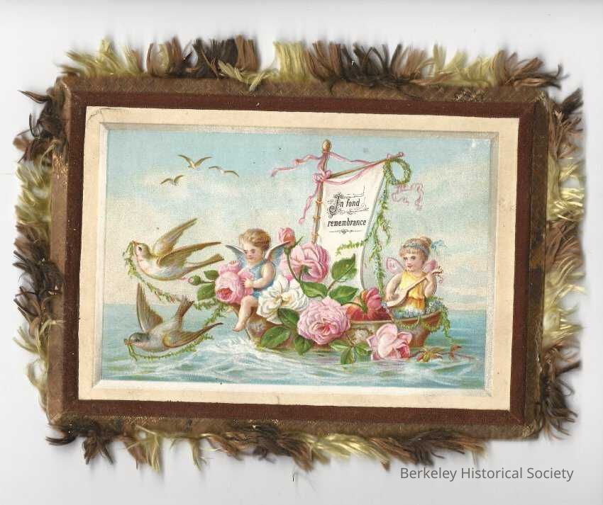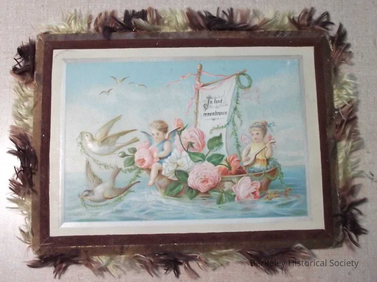 Paper, embossed card mounted on a cardboard frame with yellow and brown fringe...for hanging. Picture of two angels in a boat of roses being pulled by birds and the sail reads "In fond remembrance". Pastel colors of pink and blue. From Ethel Greenough Watson, who lived at 2717 Telegraph.Made/Created