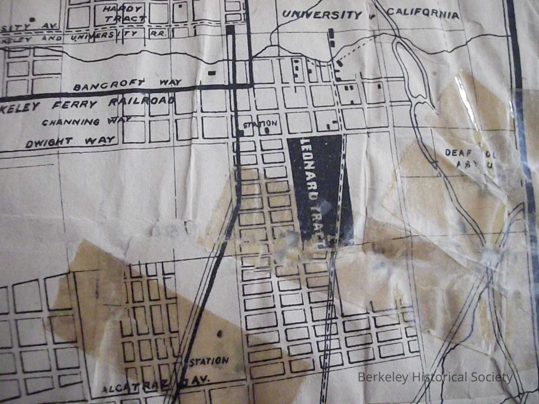 Map shows lots in relation to San Francisco. The Haywood and Jacob wharf at foot of University was the Berkeley Wharf with ferry boats to San Francisco, at location of Ferry Building (1898). The map shows the Berkeley Ferry Railroad: University, San Pablo, Bancroft, Ellsworth. With this; small photographic copy.