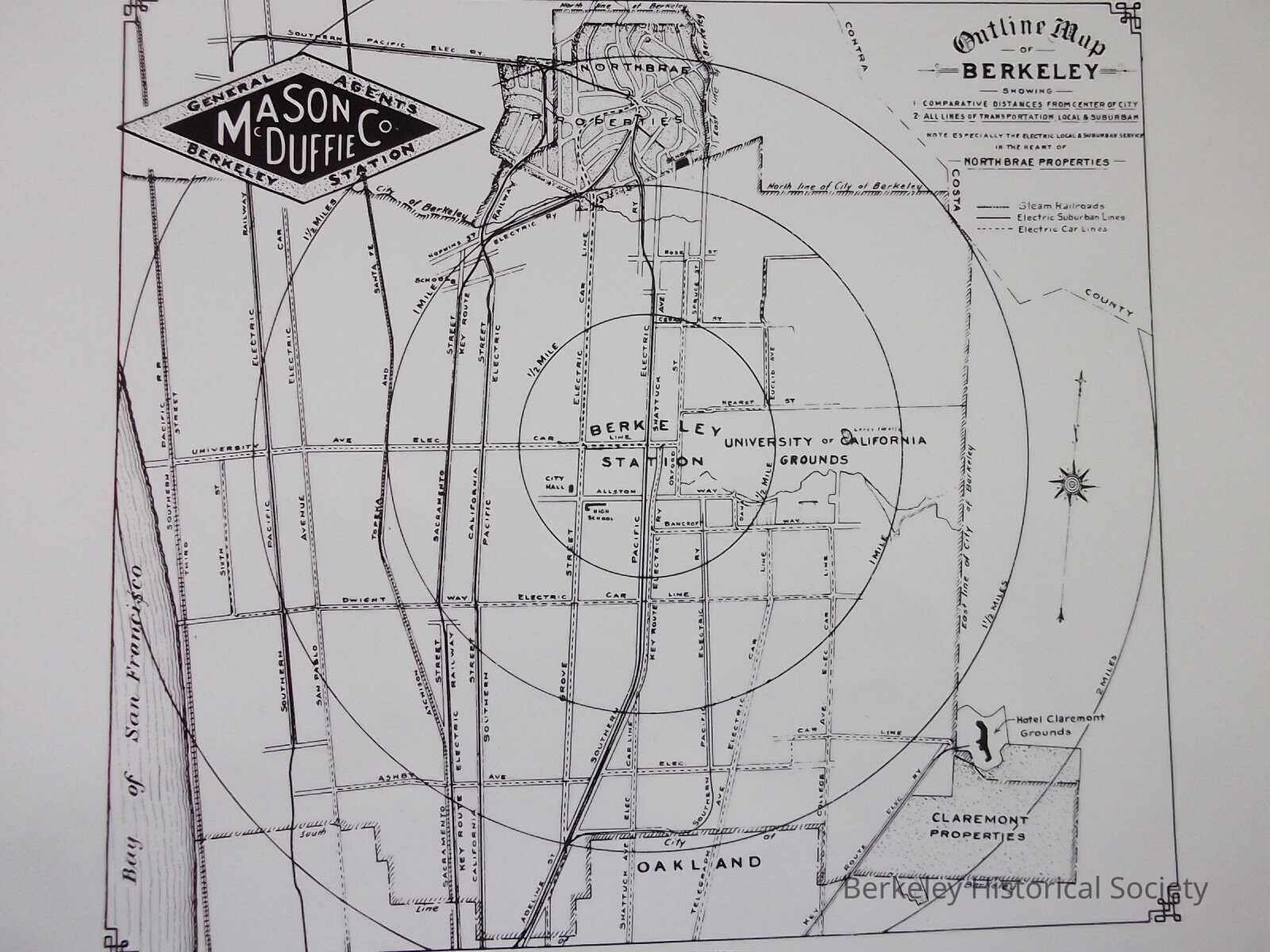 Outline map of Berkeley showing 1. comparative distances from center of the city 2. all lines of transportation, local & suburban...Northbrae properties.Entry/Object ID