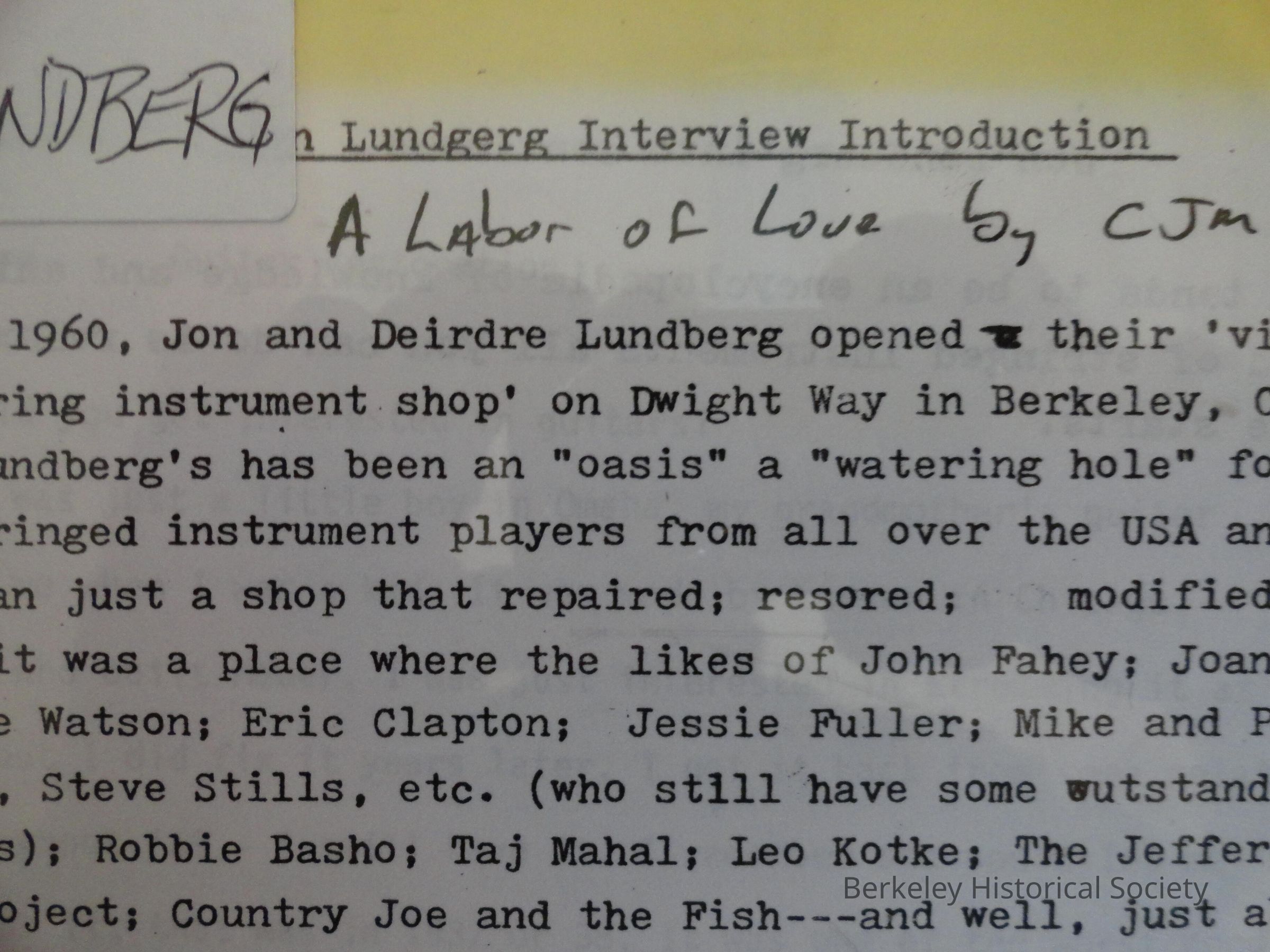 Interview conducted by Country Joe McDonald. 26 p. ; 29 cm.