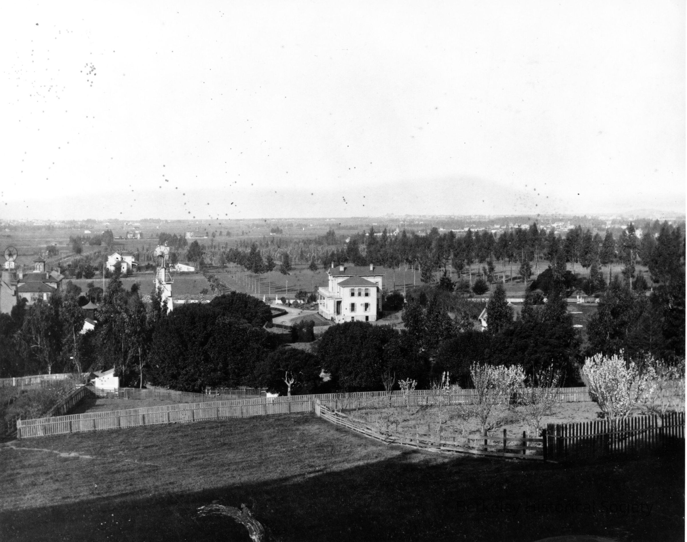 Cox house on Claremont Avenue. View looking west from hills; bay in distance. Orchard trees in foreground right.