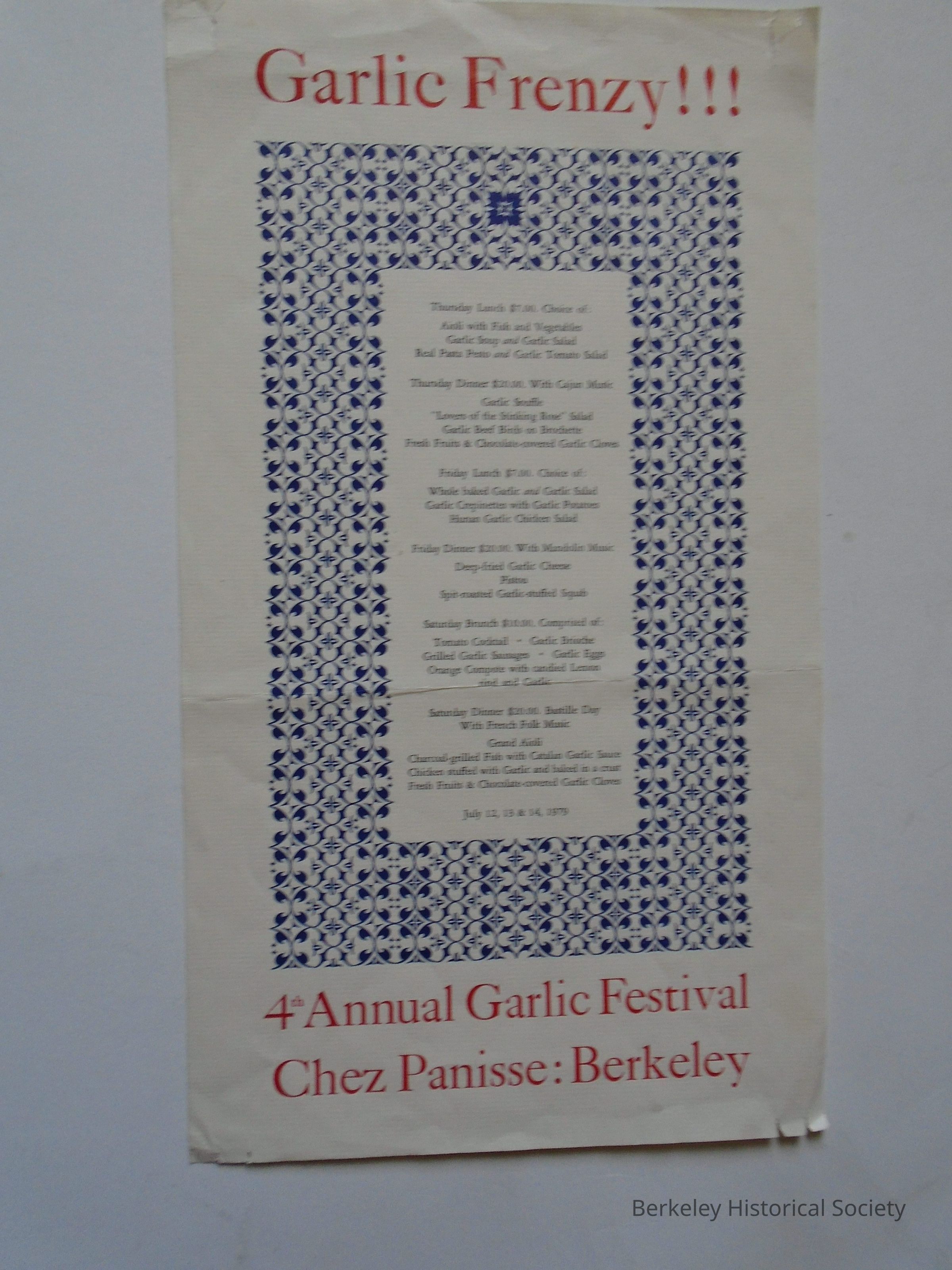 Chez Panisse paper menu for Garlic Frenzy!!! 4th Annual Garlic Festival Chez Panisse: Berkeley, July 12, 13 & 14, 1979.