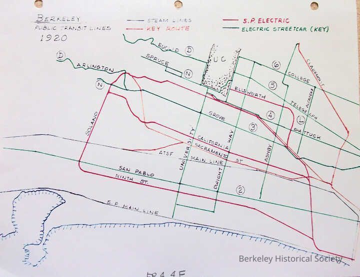Pen and ink drawing showing streets with transit lines. Different types of lines indicated by color, with line numbers. Drawer FB-5a Folder FB5ab