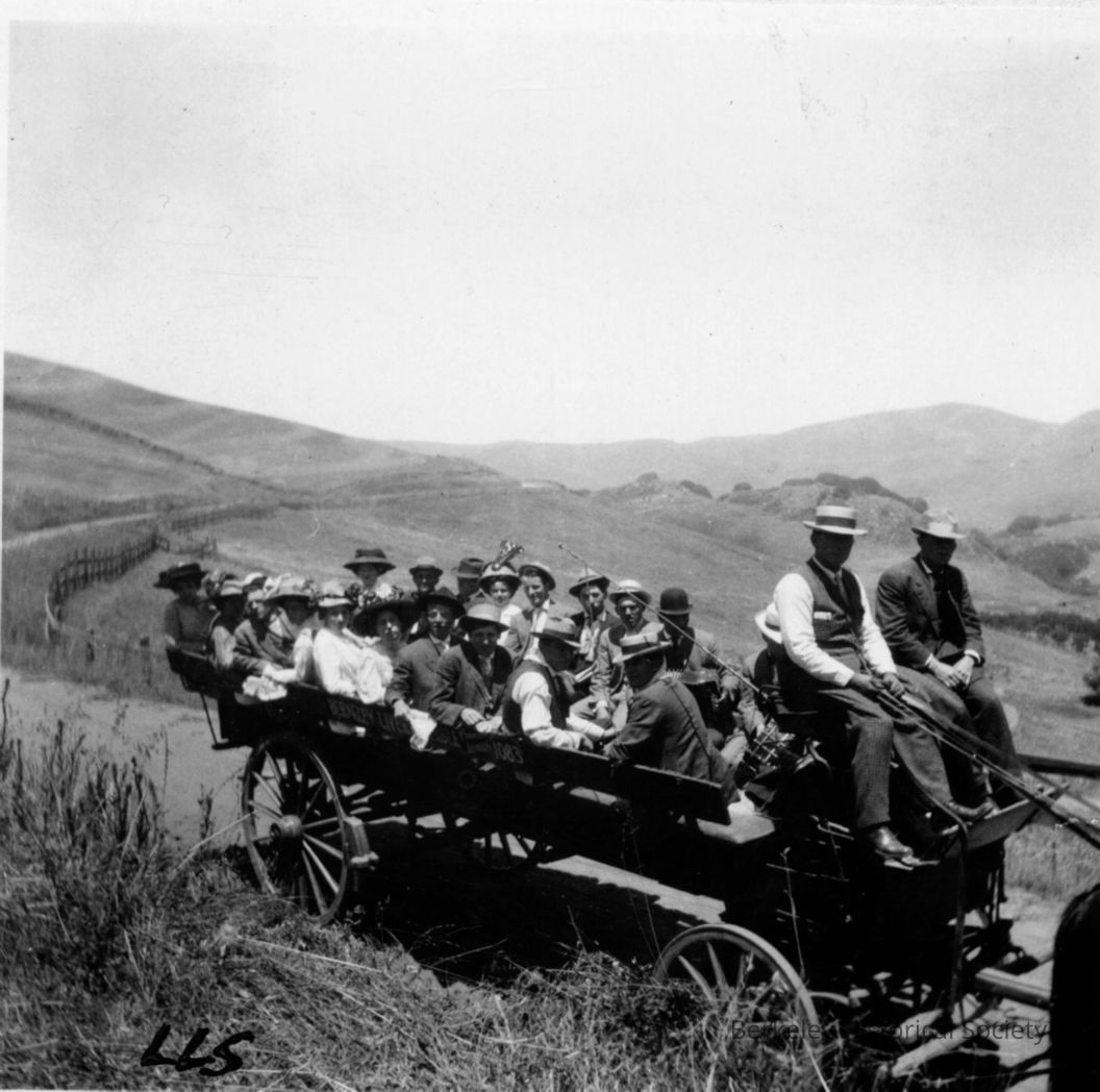 Large group of people in wagon, Wagner Road to Curran Ranch, Wildcat Canyon. Native Sons picnic.Other Names and Numbers