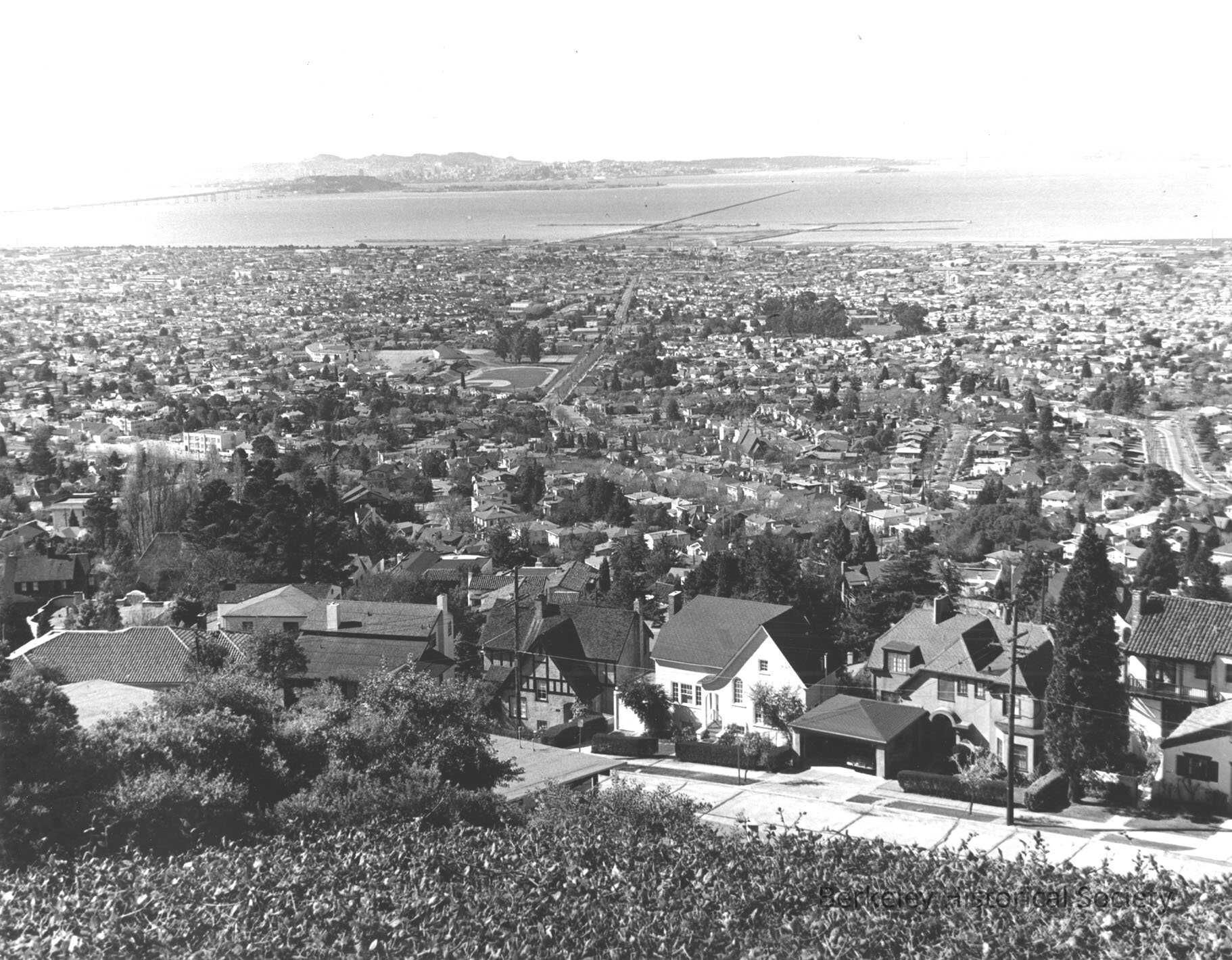 West from hills. Euclid Ave. in foreground. Berkeley Pier, center.