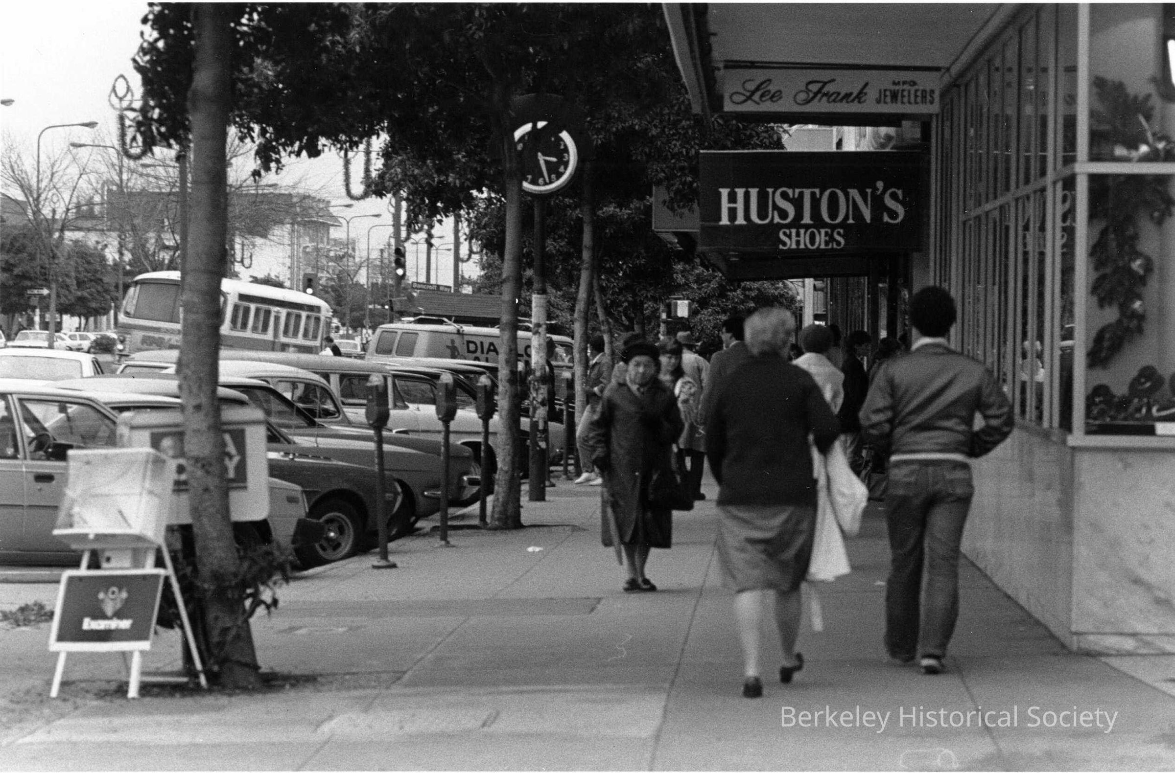 Shattuck Ave. looking S. along sidewalk from Allston Way. Huston's Shoes; Lee Frank Jewelers. Pedestrians; cars.