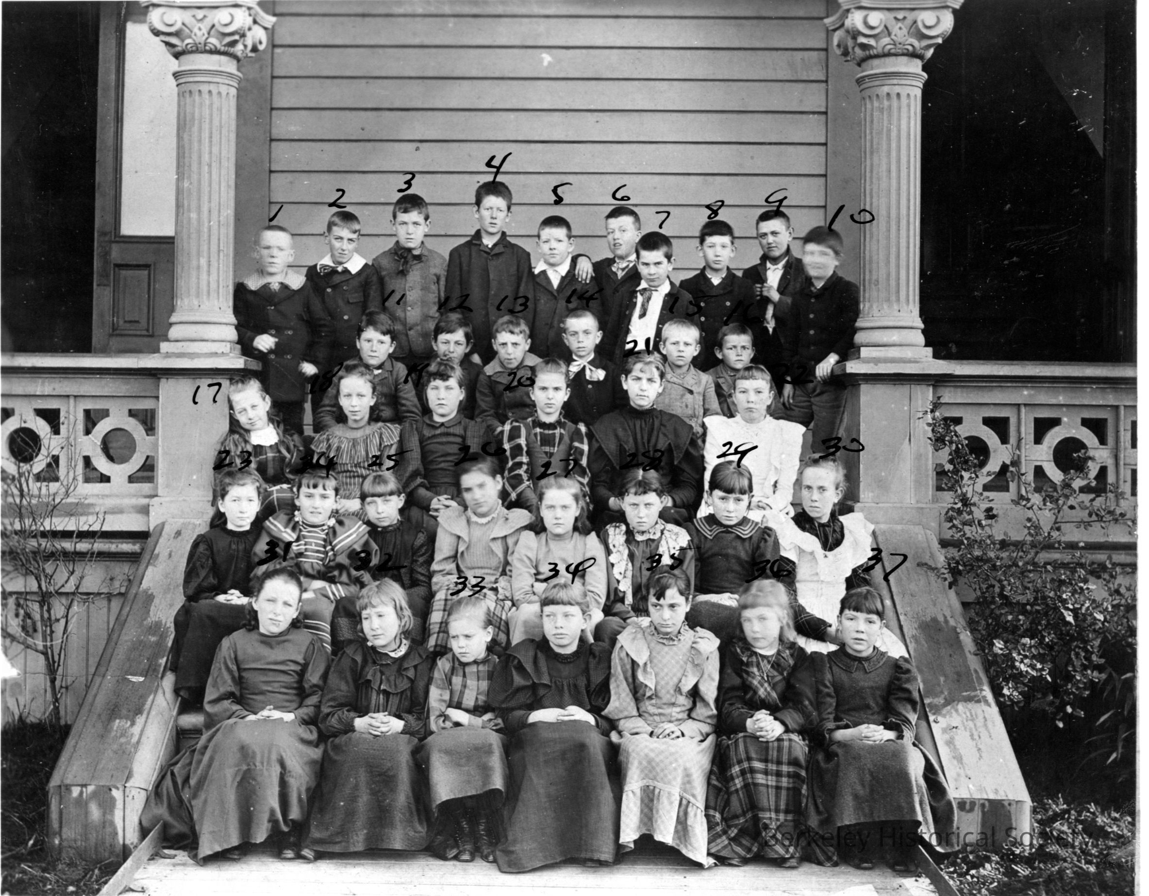 Class photo on steps of building. Some students numbered for identification.Other Names and Numbers