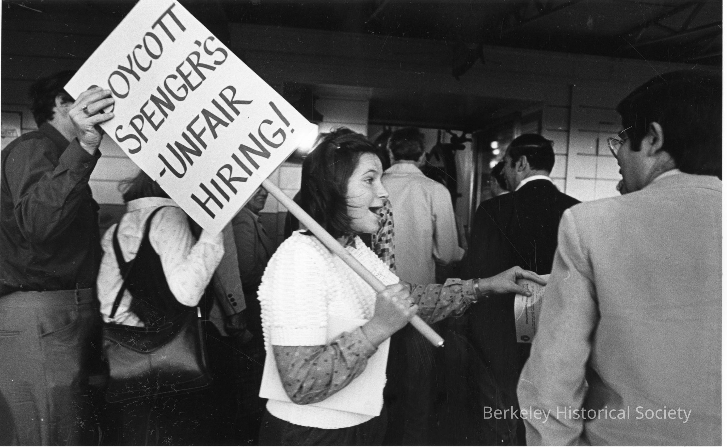 Picketers with placards: Boycott Spenger's - Unfair Hiring.