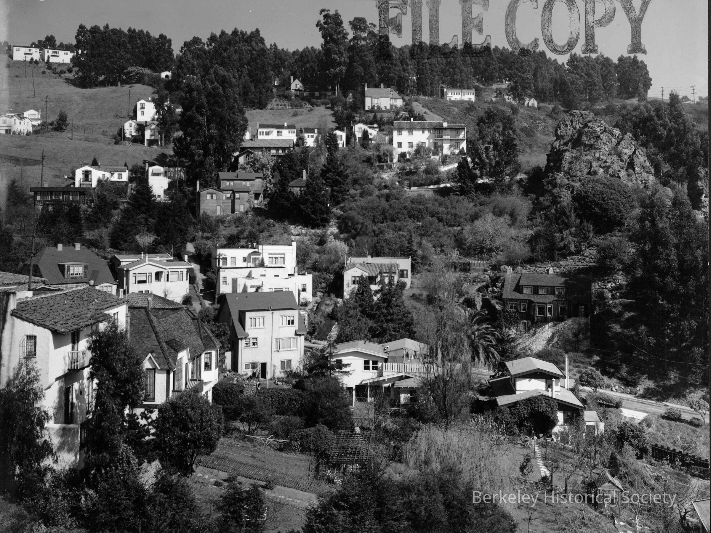 Landscape - view of hillside homes from above Regal Rd. and Poppy Lane; Pinnacle Rock at right..