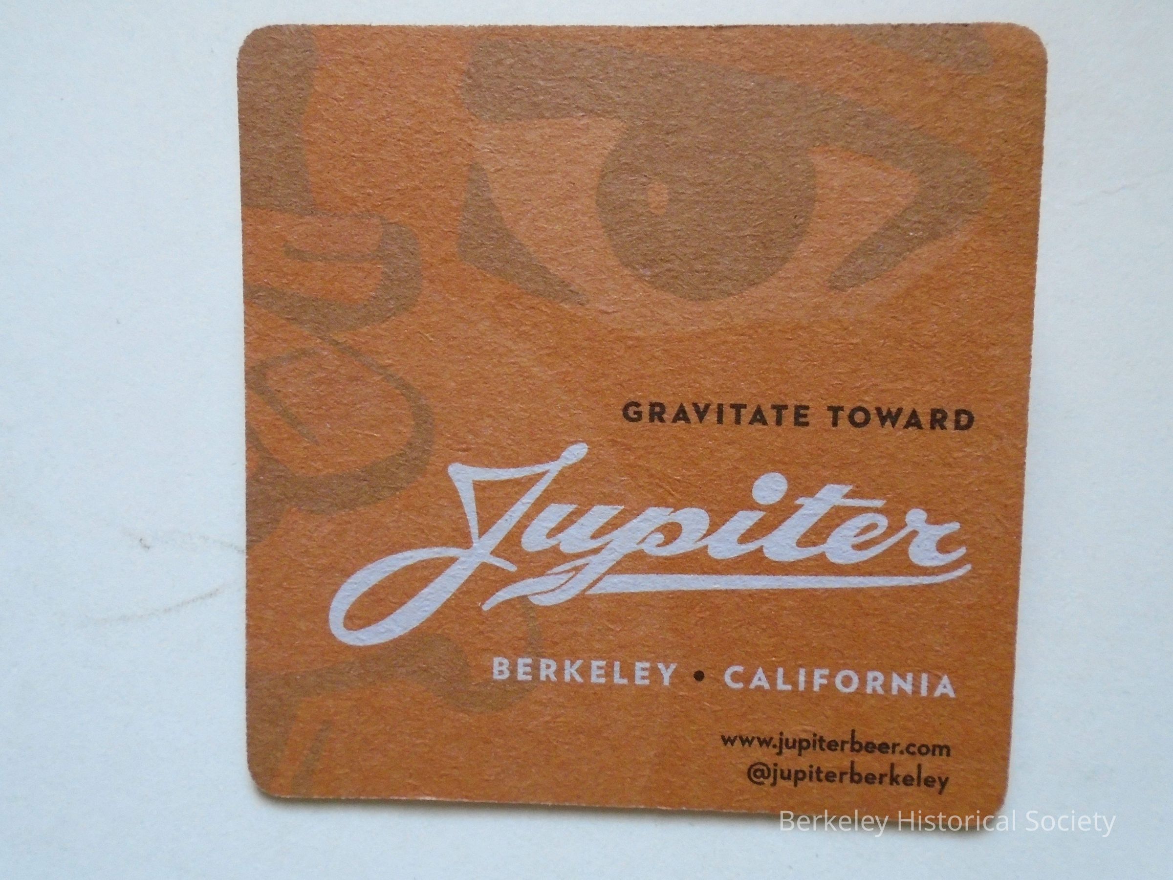 Paper coaster for Jupiter. "Gravitate Toward Jupiter". On reverse side: Jupiter IPA. Located at 2181 Shattuck Ave. Adjacent to Trumpetvine Court. Handcrafted ale and pizza.Made/Created