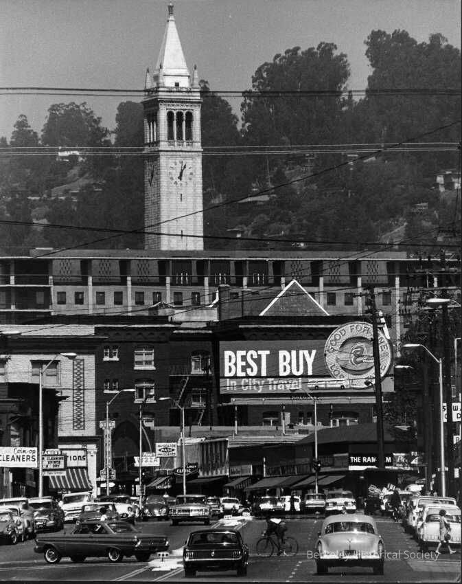 Streetscape-Telegraph Ave. from south of Dwight.1950 Campanile in background. Cars, pedestrians.