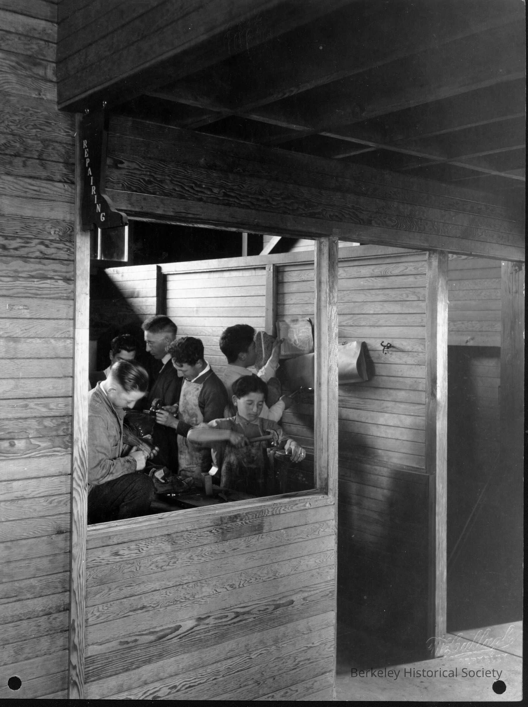 Burbank Junior High School. Shoe repair shop; students and teacher.