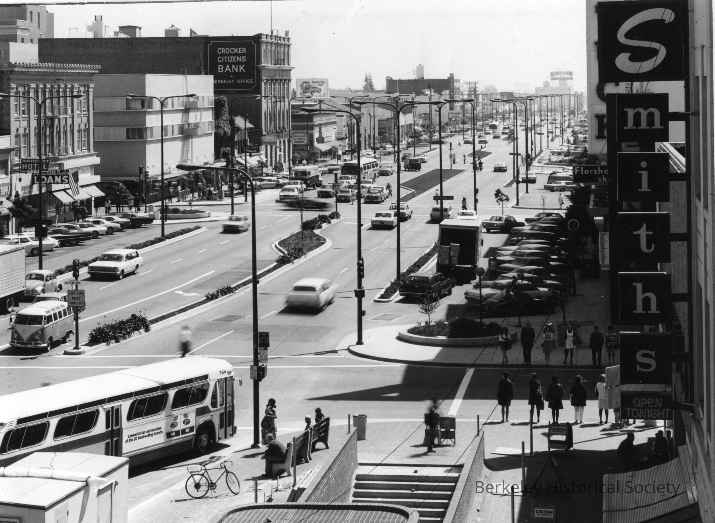 View south, stairs to BART in foreground. Smiths sign in right foreground.