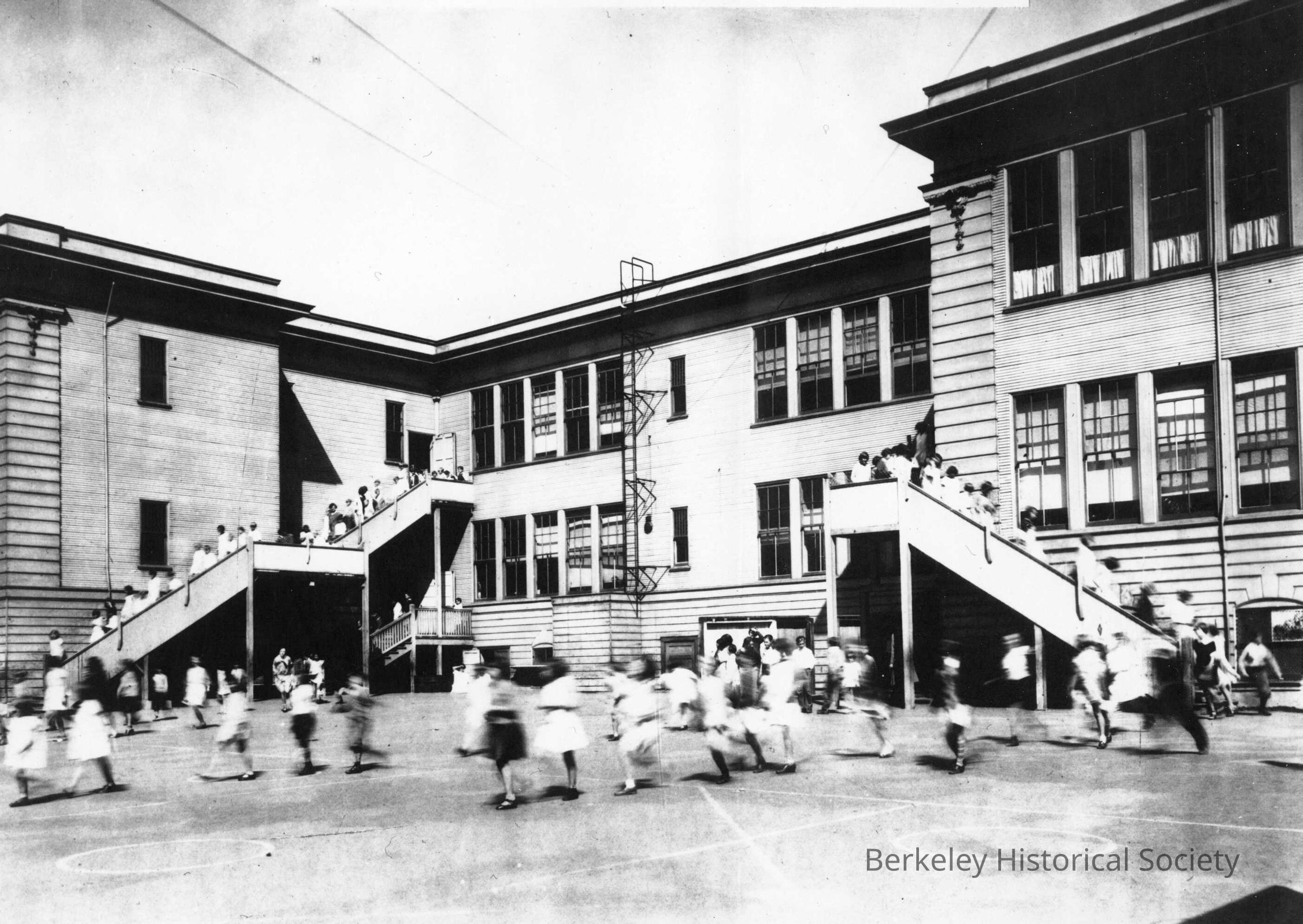 Washington School exterior (rear) with children on wood fire escapes. 223-192-1848