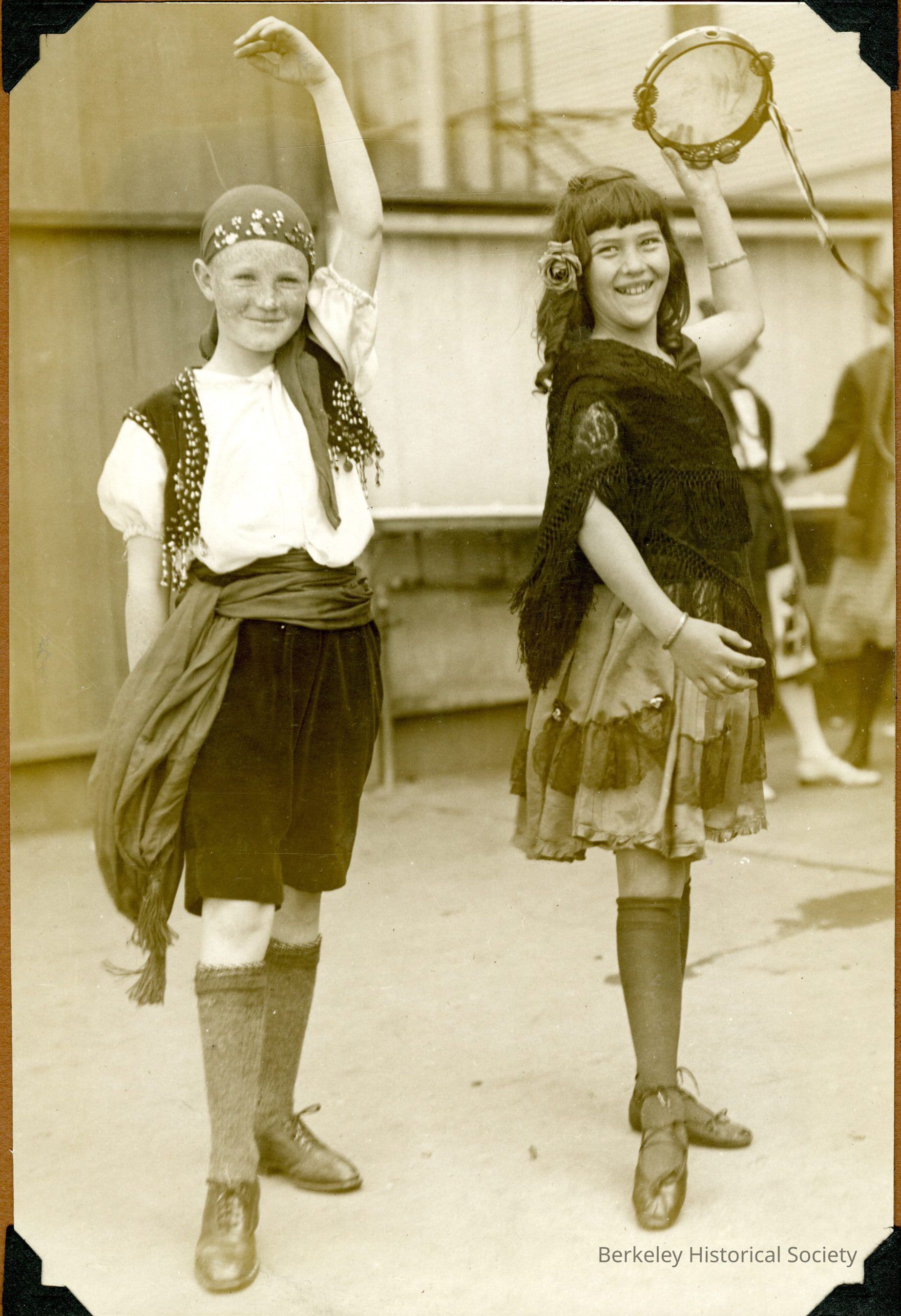 Girls dancing. One holds a tambourine.