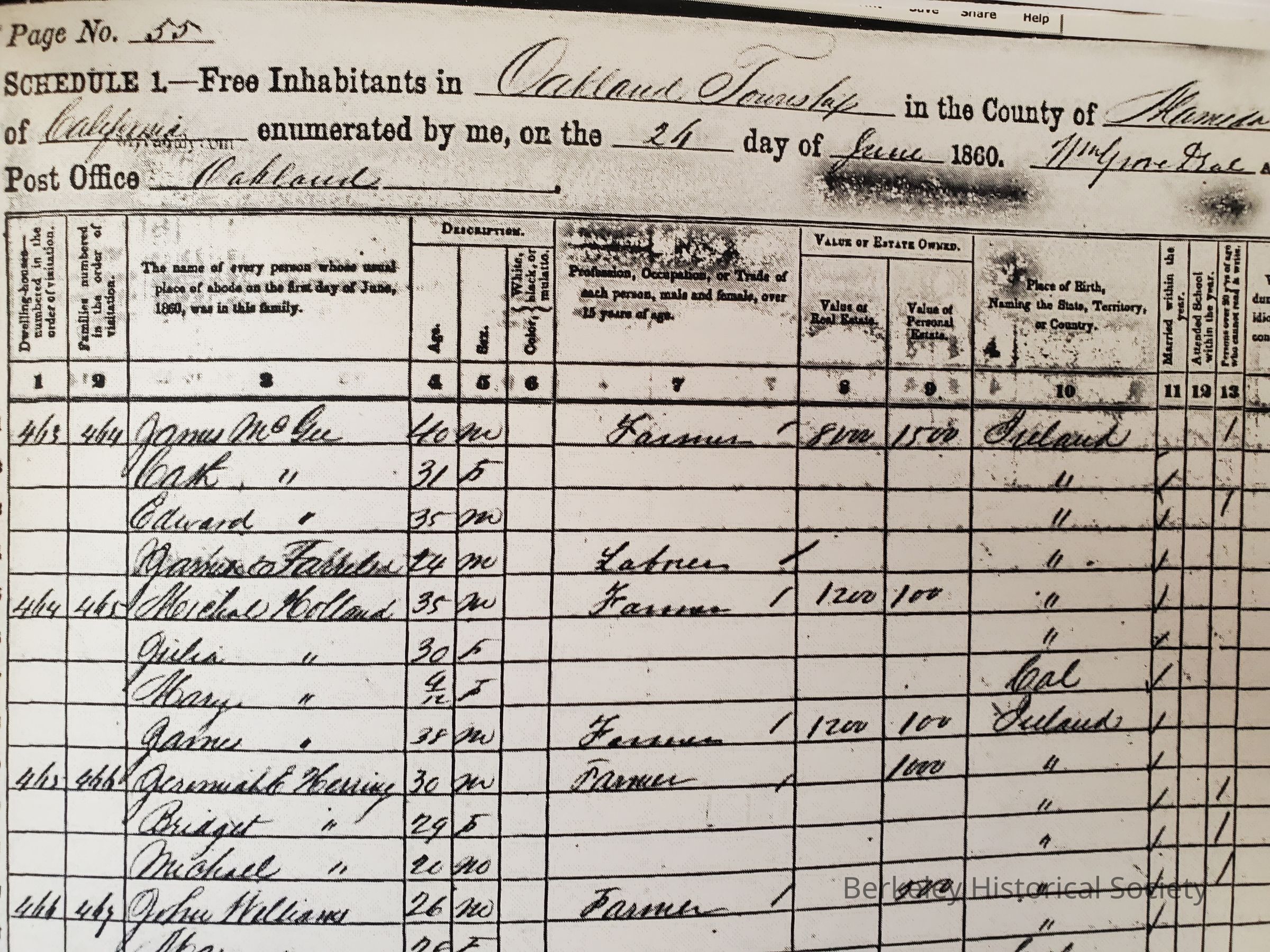 Items relating to James McGee who came to Berkeley in 1856, his forebears and his daughters (Catherine and Maria Anna), his property, his estate, etc. Include copies of census records, death notices, baptism records, citizenship documents, a family tree. Mainly photocopies assembled by Marion Kennedy.Archive Details