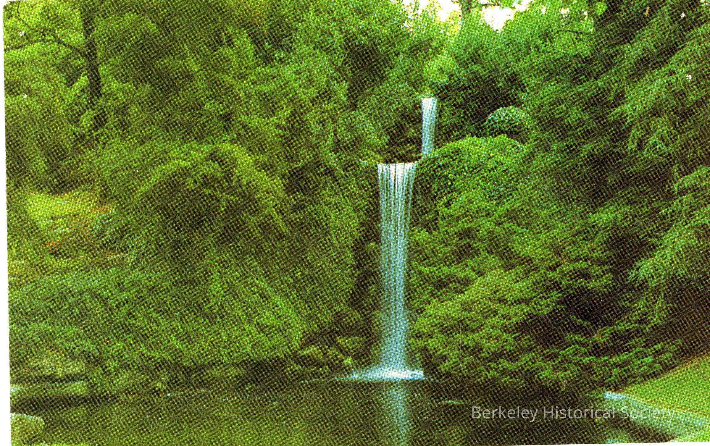 Divided postcard featuring color photograph of waterfall in the Sunset View Cemetery and Cermatory's urn garden. No message present.