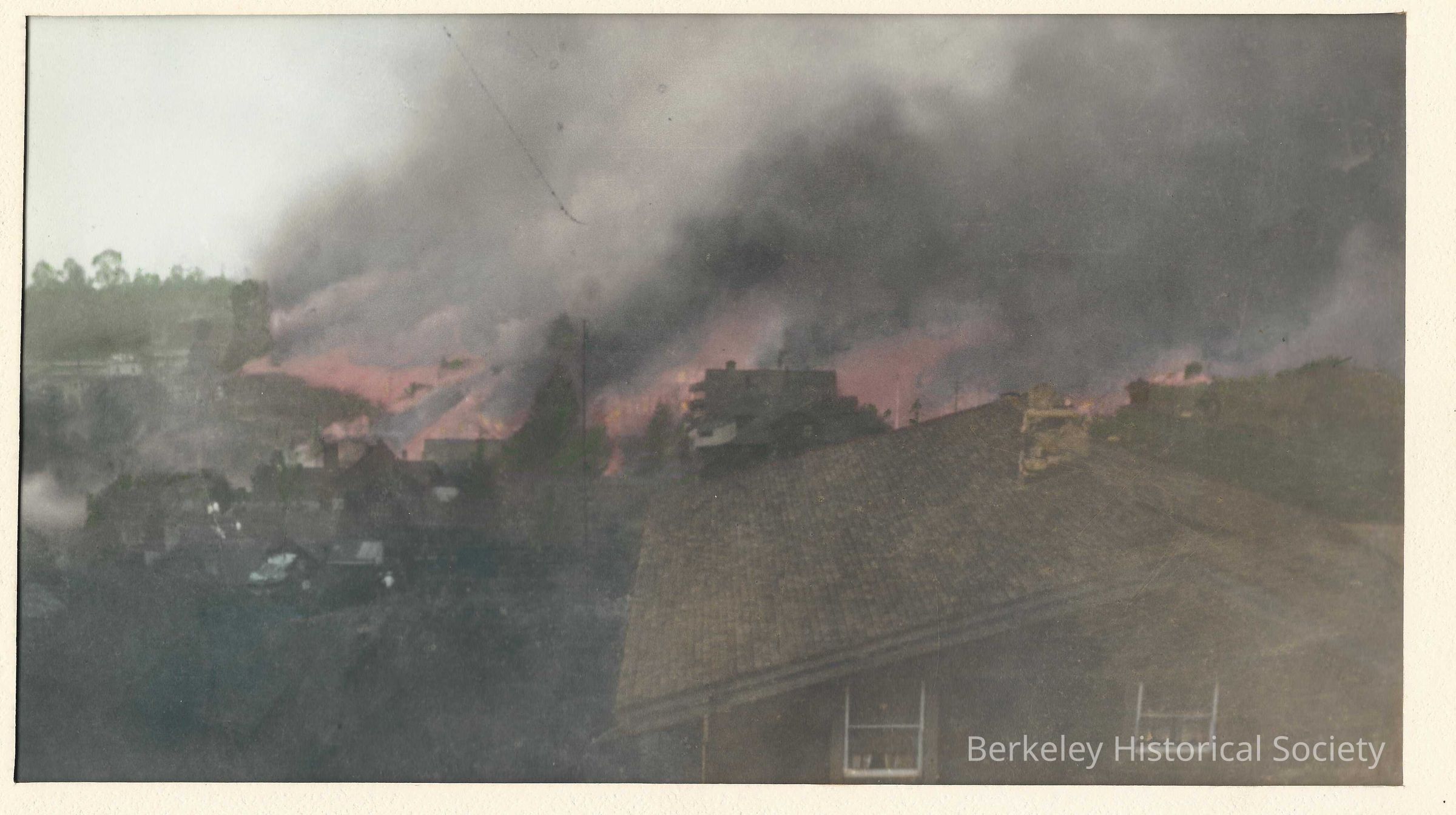 Large tinted photo panoramas of the Berkeley fire of 1923