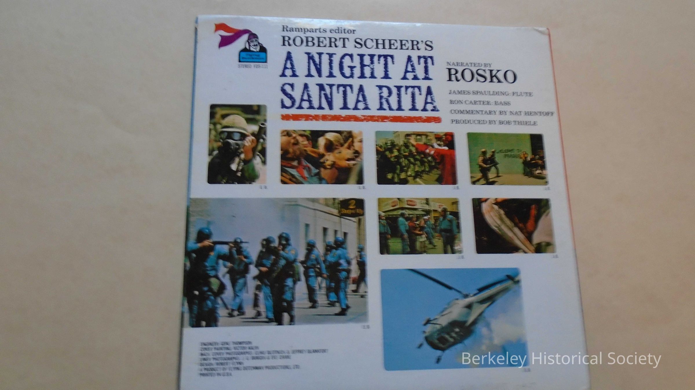 Vinyl record, L.P.(33 1/3 rpm) "A Night at Santa Rita" in a cardboard folder cover. Copyright 1969 by Flying Dutchman Productions. Rbt Scheer's (editor of Rampart's Magazine) account of a night in Santa Rita jail read by Bill "Rosko" Mercer after he was arrested in the Berkeley People's Park protest, 1969. Covers freedom of speech, prison brutality. Rbt Scheer lived near People's Park and was a candidate for Congress in the Berkeley/Oakland community in 1966 (received 45% of vote). Music by James Spaulding, flute and Ron Carter, bass.Lexicon