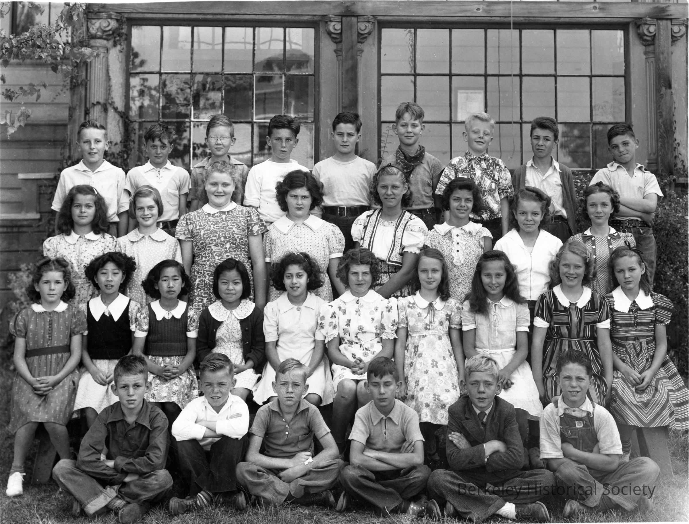 Class photo, in front of windows of school. Some students identified.Other Names and Numbers
