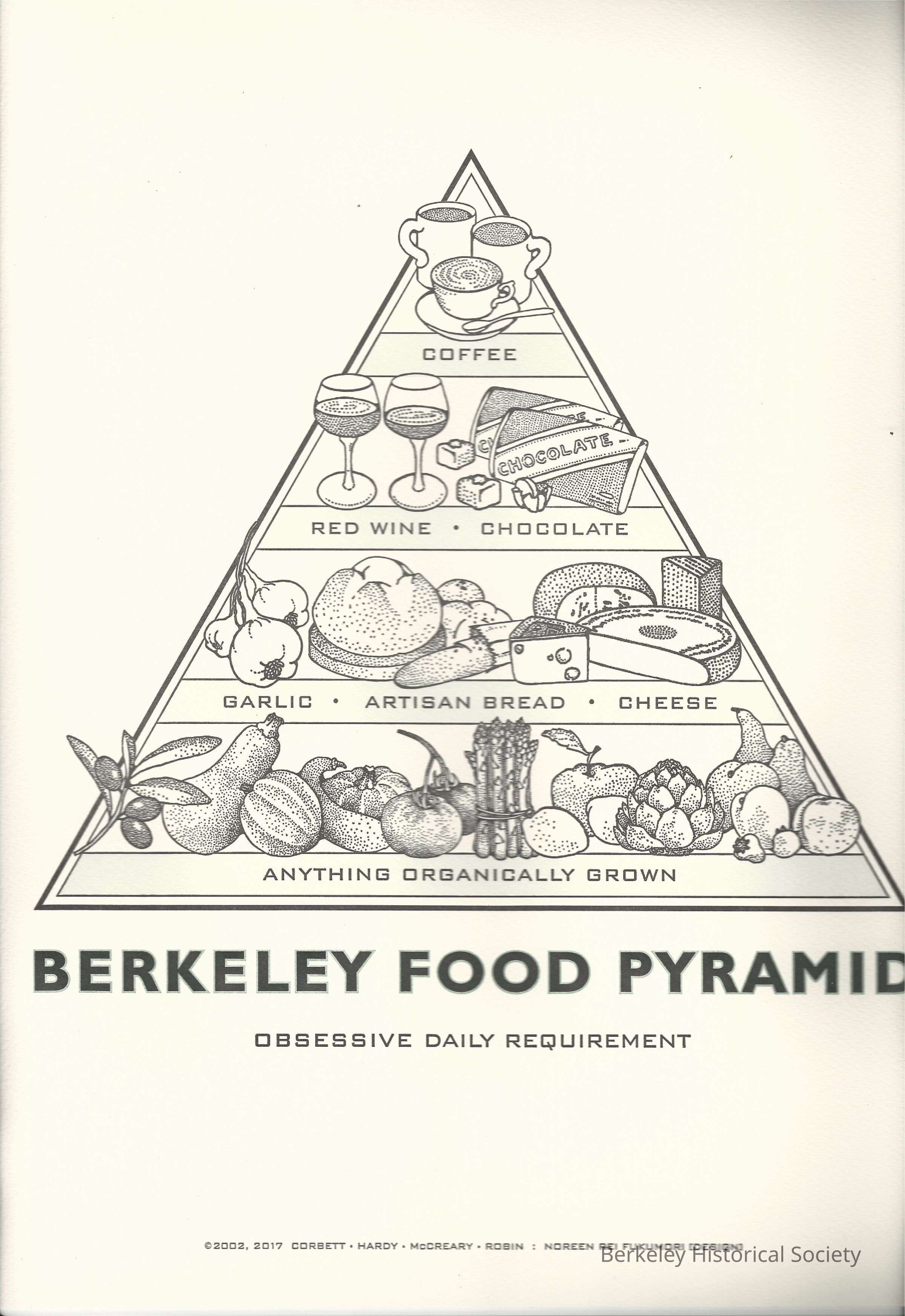 Berkeley Food Pyramid: Obsessive Daily Requirement. A humourous poster based on a perception of Berkeley food habits. Two versions of the Berkeley Food Pyramid.