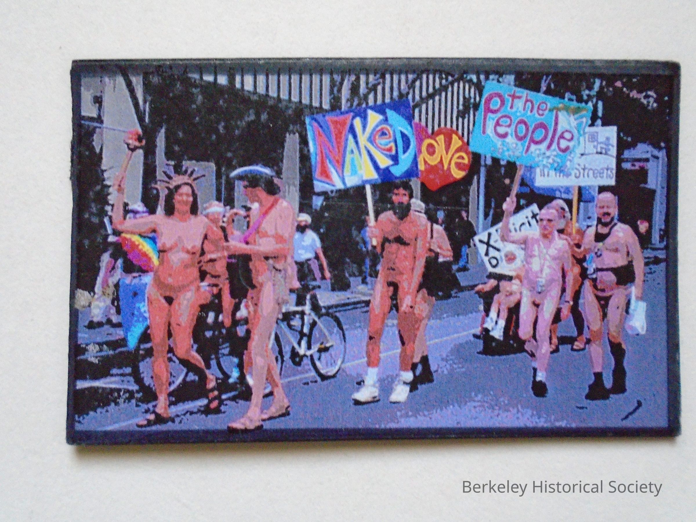 Plastic magnet with picture from the "How Berkeley Can You Be?" parade. Sticker on back: A. Stross, photographer.