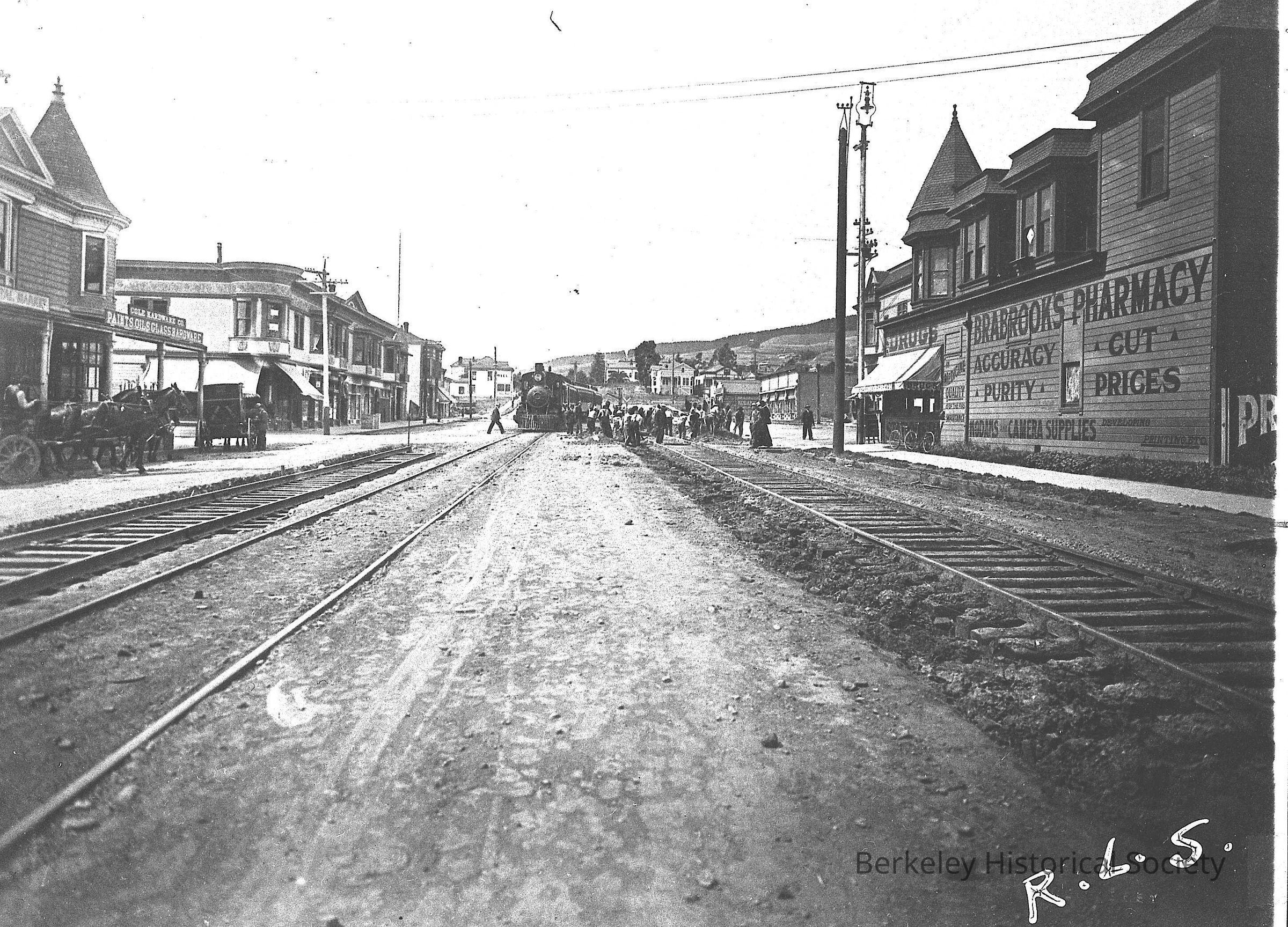View looking north on Shattuck toward Vine Street from middle of street, with steam train and people at Vine. Buildings on both sides of street. Shops include Cole Hardware, Brabrooks Pharmacy (later McHaffie's), Ruckers Market, and possibly Capital [not Capitol] Market.Made/Created