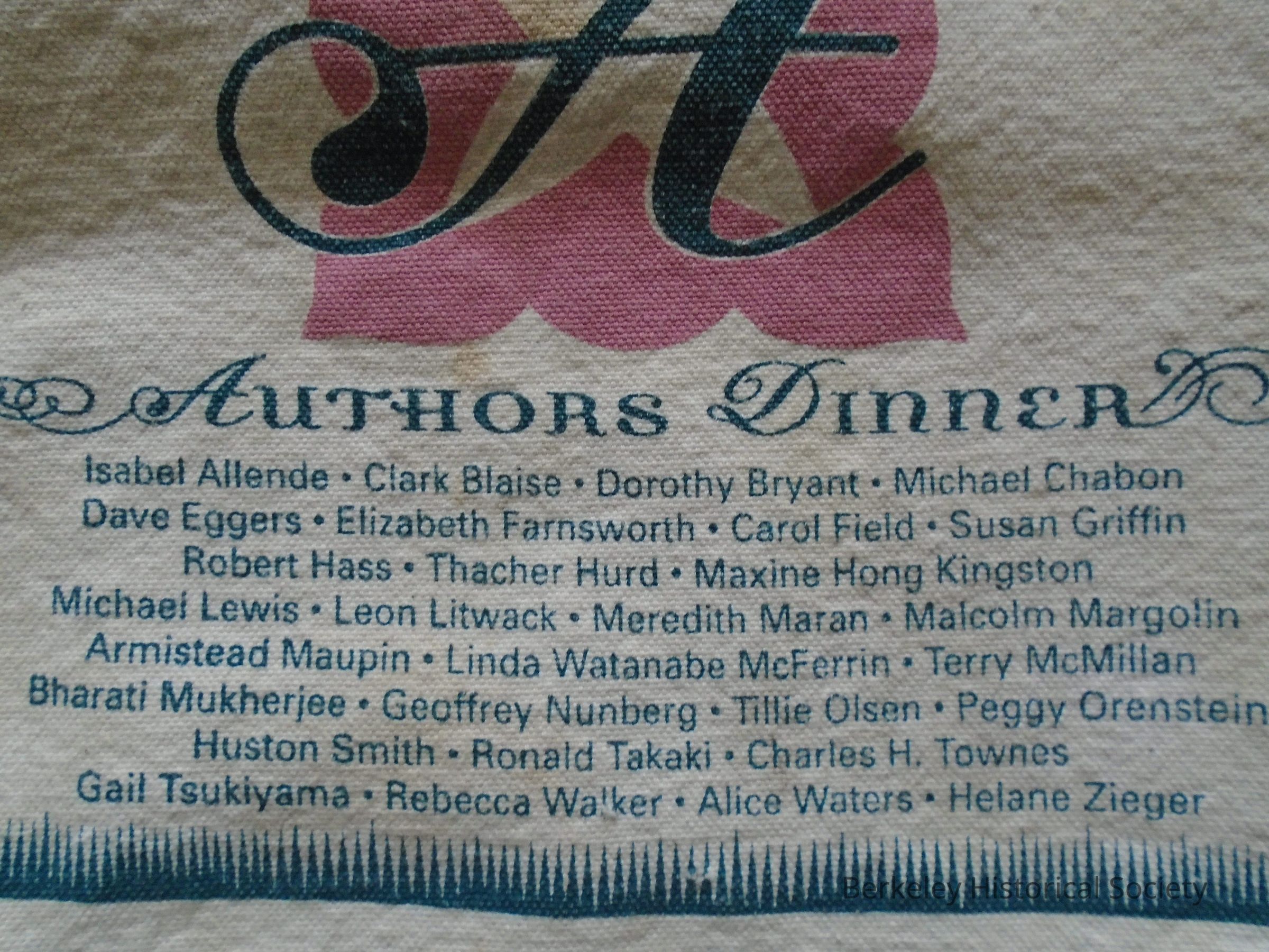 Canvas bag from The Berkeley Public Library Foundation Author's Dinner. Shows pink and black text/logo and underneath lists authors "celebrated". Label inside shows: Save a Tree, 100% cotton, Handsewn in U.S.A., PO Box 862, Berkeley, Ca, 94701.Dimensions