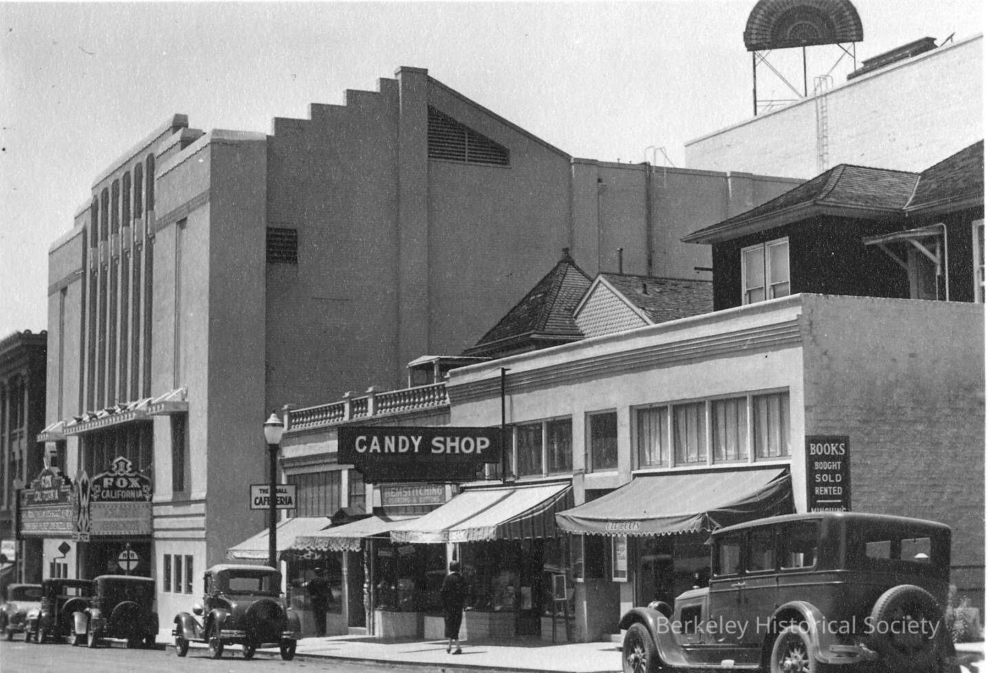 Fox California Theatre, 2111 Kittredge Street. Adjacent building has signs for a candy shop and a bookstore. "The T & D Theatre was built for live theatre and movies. Designed in a Greek Revival style by architect Albert W. Cornelius, it opened December 9, 1914 with the Italian movie 'Cabiria.' It had an orchestra and was equipped with a Wurlitzer 2 manual, 7 ranks organ which had been transferred from the Embassy Theatre, San Francisco. Two more ranks were added to the instrument. It was taken over by West Coast Theatres in early-1928 and was closed on May 5, 1928 for remodeling to the plans of architectural firm Balch & Stanbery, reopening on October 10, 1930 as the New Fox California Theatre with Charles ‘Buddy’ Rogers in 'Follow Thru' and organist Floyd Wright playing the Wurlitzer organ. It was remodeled in 1952 and the Wurlitzer organ was removed in 1954, transferring to Vallejo. The California Theatre was triplexed on April 9, 1976 and renamed California Cinema Center. The California Theatre has been operated by Landmark Theatres since 1994. Known as ‘The Cal’ to locals, the theatre closed in 2001 and was reopened by Landmark on June 28, 2002. It was closed on March 16, 2020 due to the Covid-19 pandemic. Landmark Theatres announced in October 2021 that closure would be permanent. Plans have been put forward to demolish all but the façade and build a 15 story block of apartments on the site. – Contributed by Ian Grundy" [https://cinematreasures.org/theaters/1914]Made/Created