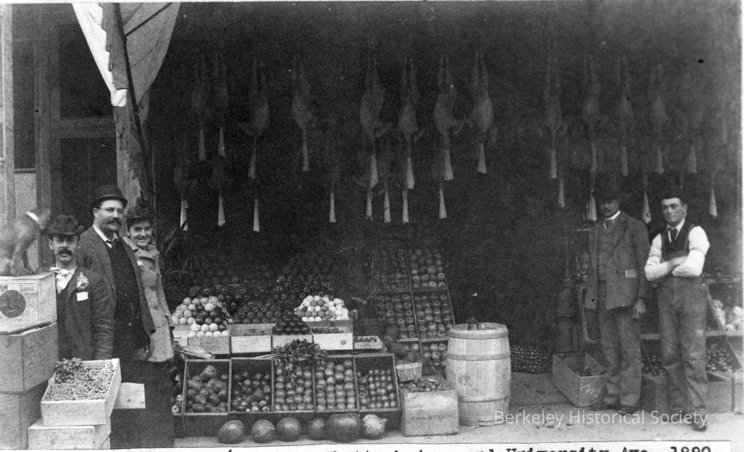 Constantine Demetrak and Nicholas Damianakis store Open front with goods on display; two people on either side. The 1891 city directory gives the name as Berkeley Fruit Market.