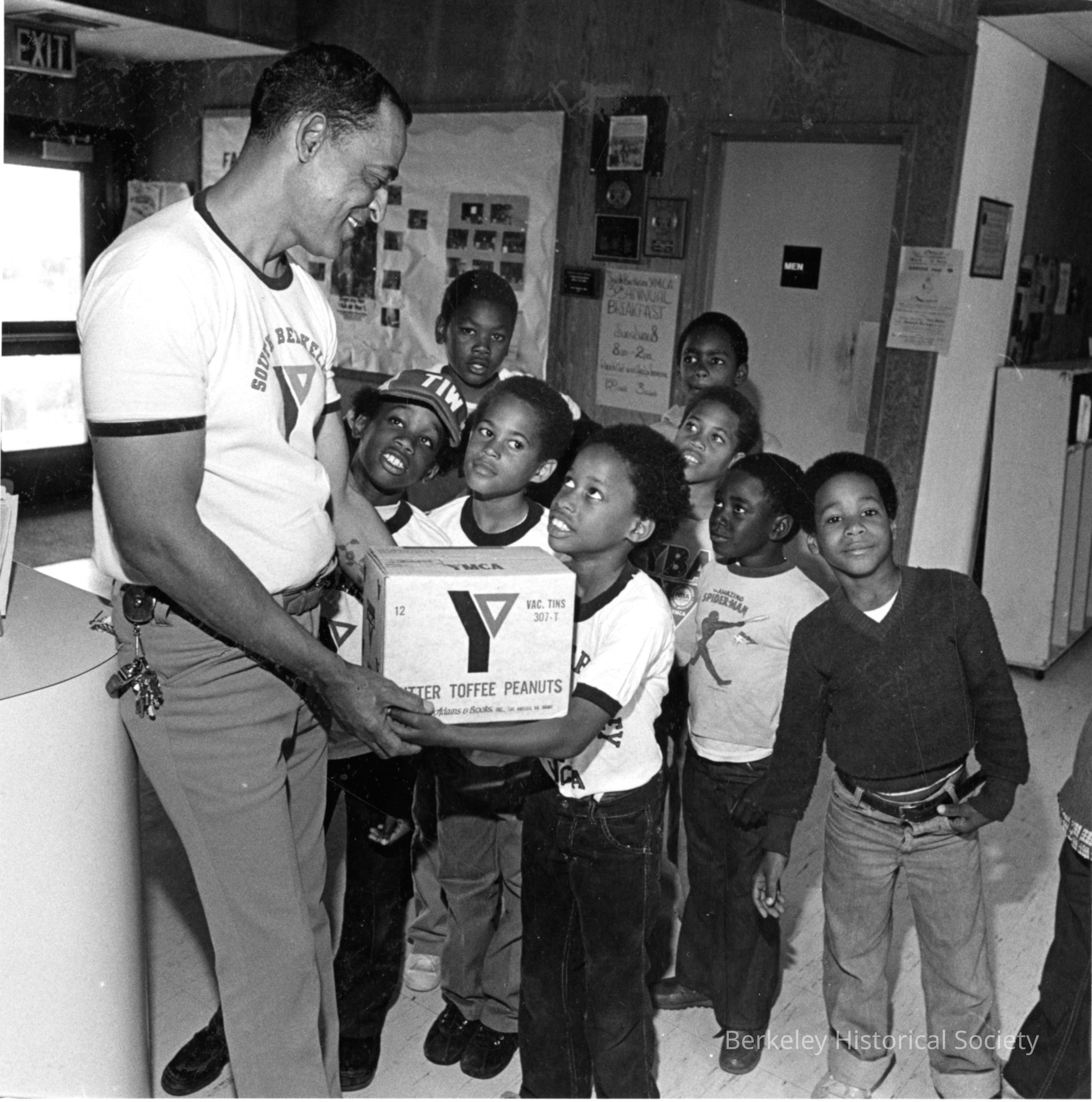 Edwin Creux giving box of toffee peanuts to Kimani Green, South Berkeley YMCA.. Surrounded by group of boys. Peanuts for fundraising?Other Names and Numbers