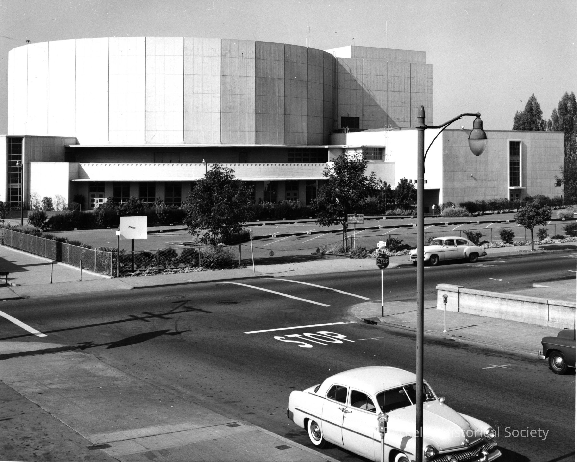 Parking lot Milvia between Allston Way and Kittredge, where Berkeley High building stands 11/14/58