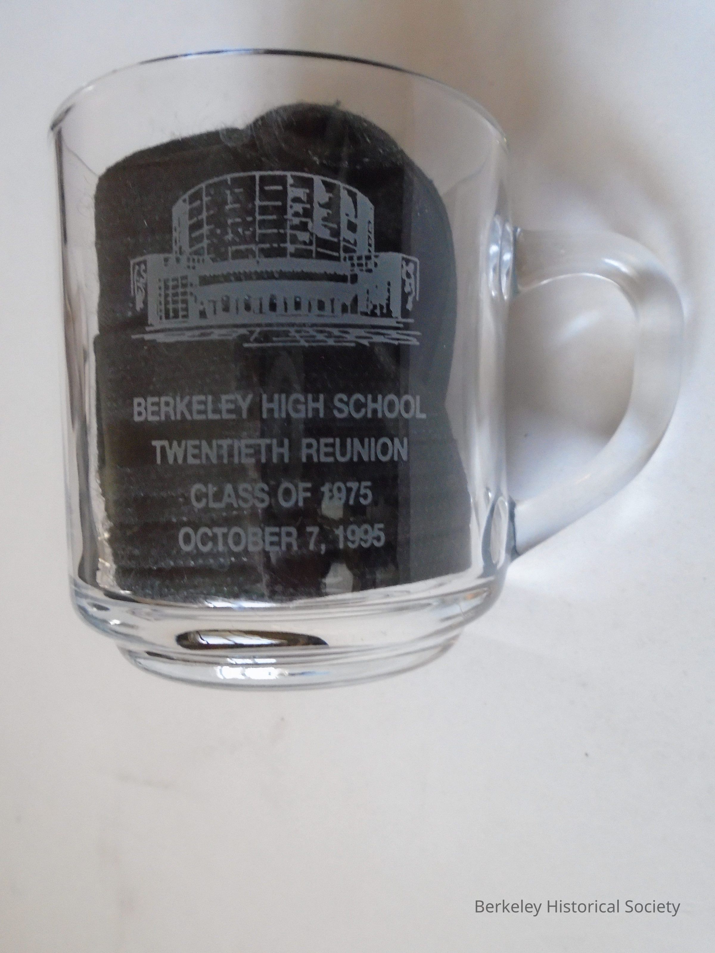 Clear glass mug/cup, engraved with a picture of Berkeley High School and text "Berkeley High School Twentieth Reunion, Class of 1975, October 7, 1995".