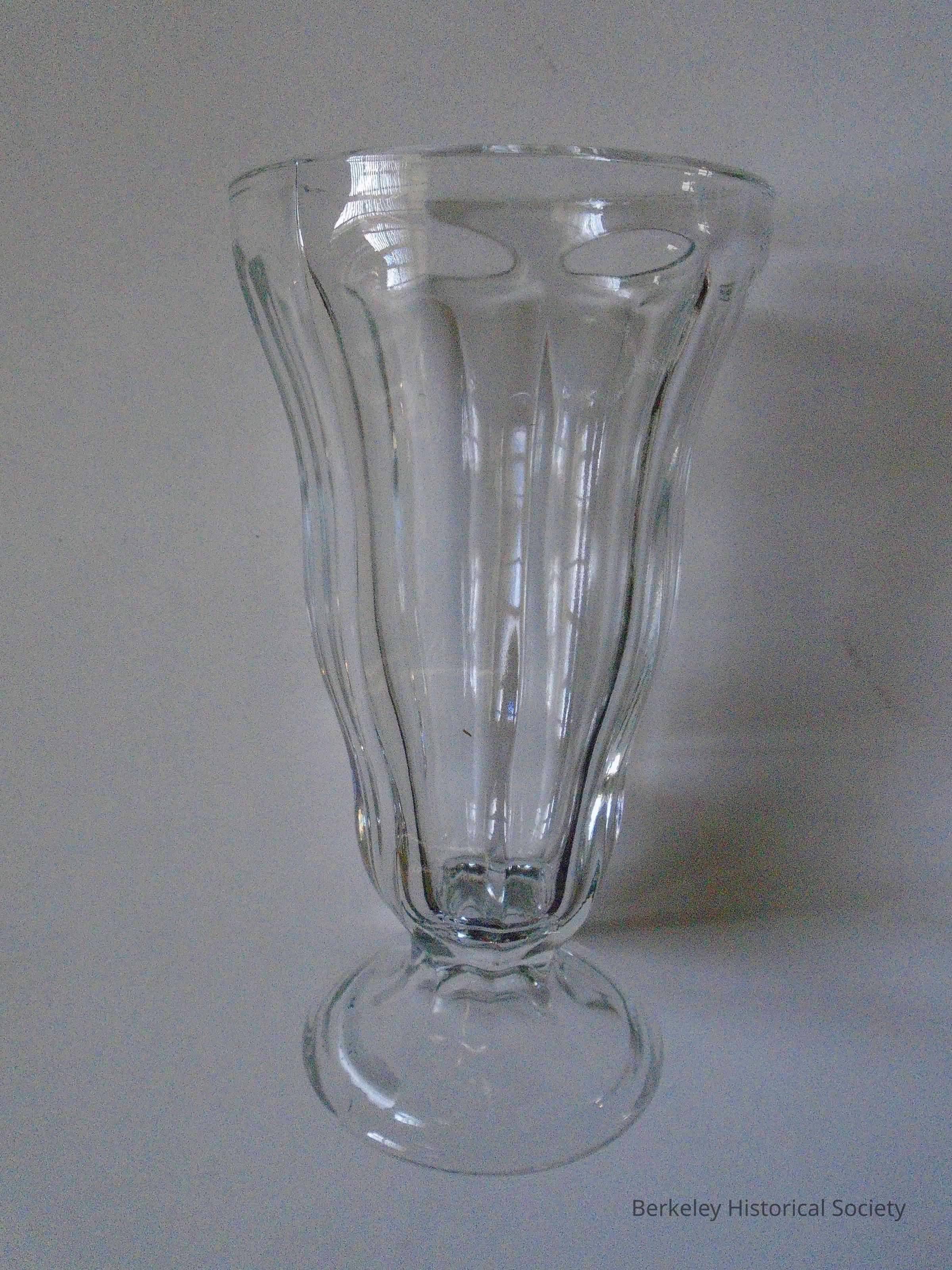 Tall glass with short stem base and wavy faceted body, used for drinks and sundaes in a soda fountain. Small chip in the rim. Used in Elmwood Fountain, c. 1950.