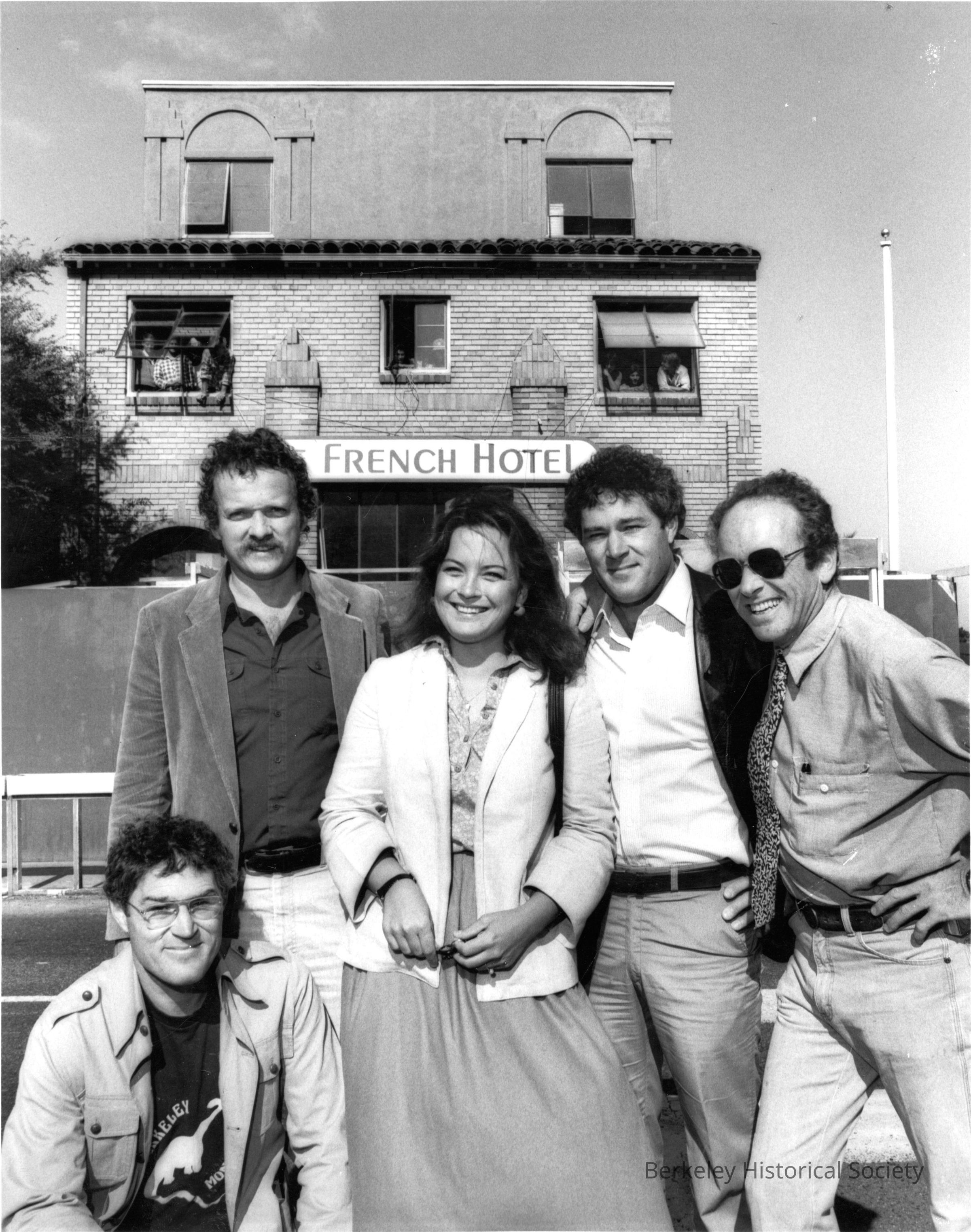 Jack Kemp, John Wolohan, Suzie Pardieu, Jim Kemp, and Steven Lustig pose for a group portrait in front of The French Hotel at 1540 Shattuck.Other Names and Numbers