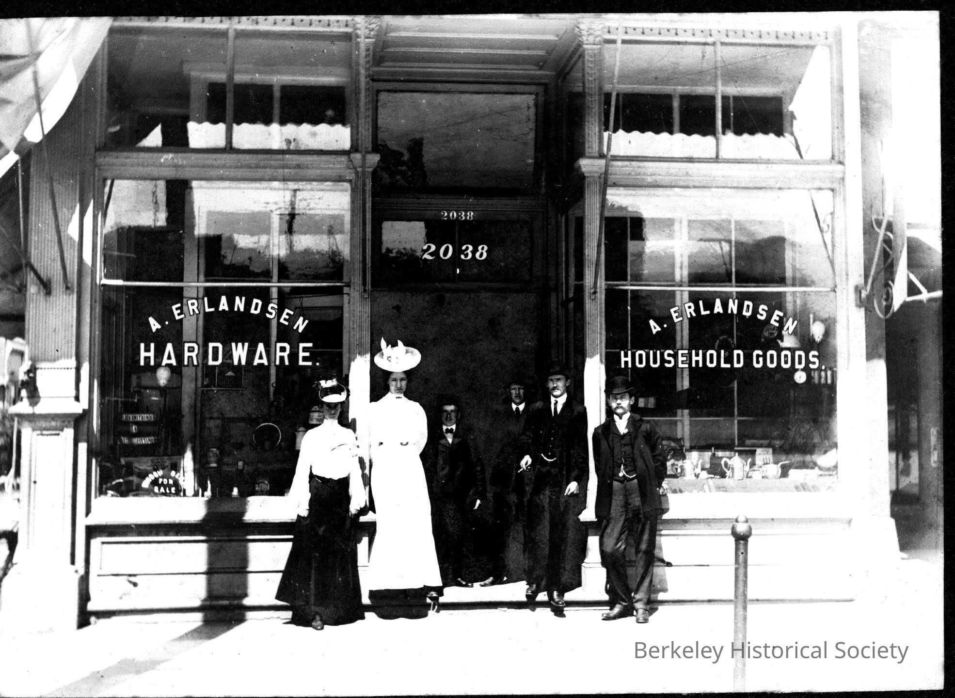 People standing in front and in doorway of A. Erlandsen Hardware & Household Goods. 2938 Shattuck Avenue.