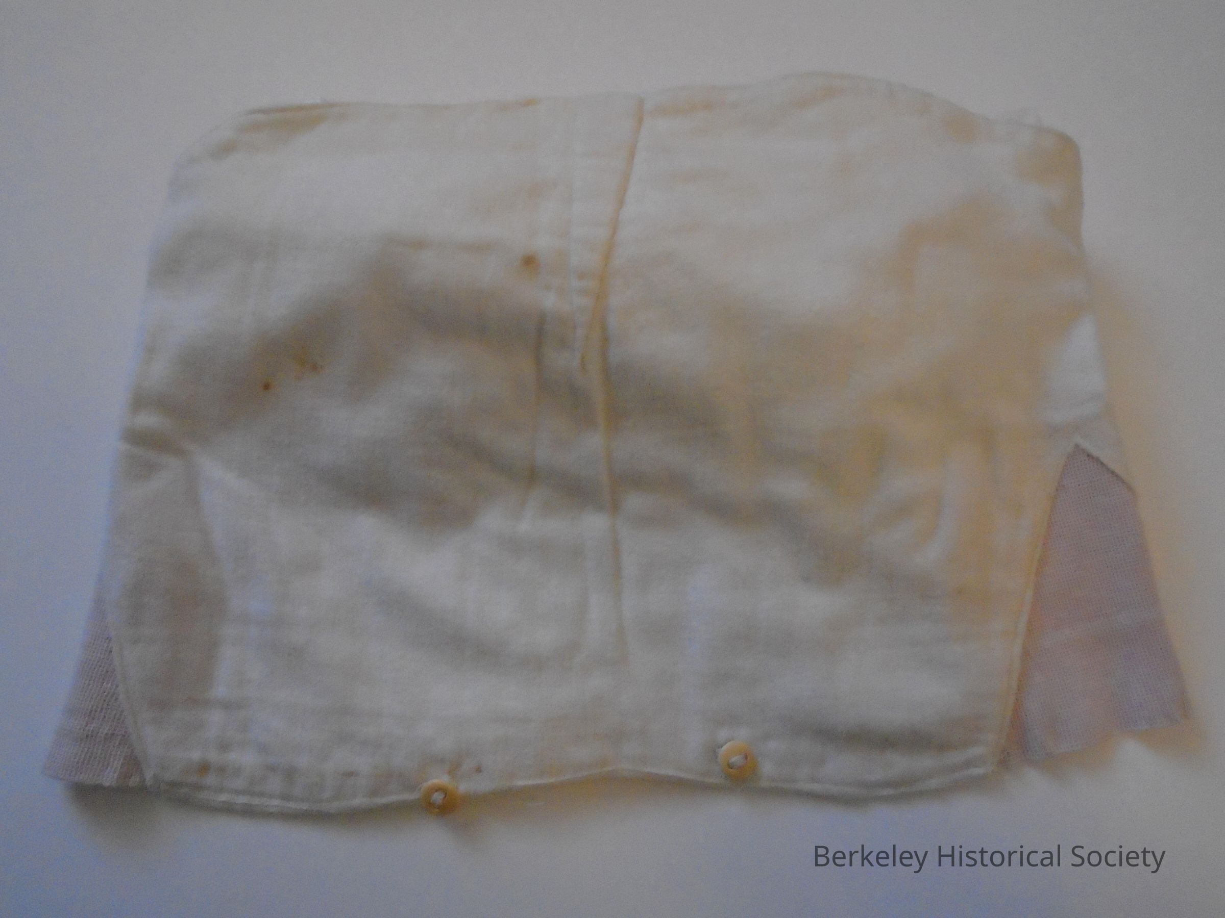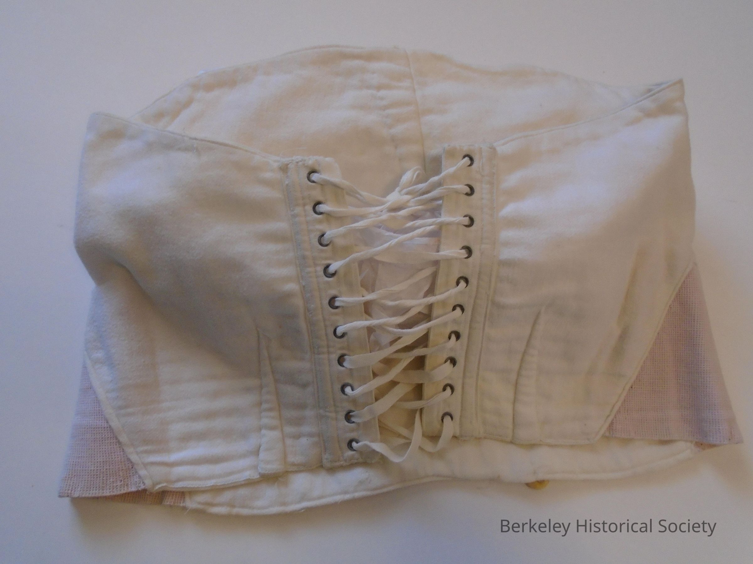 Corset, possibly an abdominal supporter (maternity). Elastic gores (inserts) each side on bottom. Laces and 10 metal eyelets in 2 rows, up & down in front. 2 darts on bottom in front. Back has one large dart on top, 2 buttons on bottom (for hose??). Slight contour from back to front. White cotton flannel, with cotton laces.