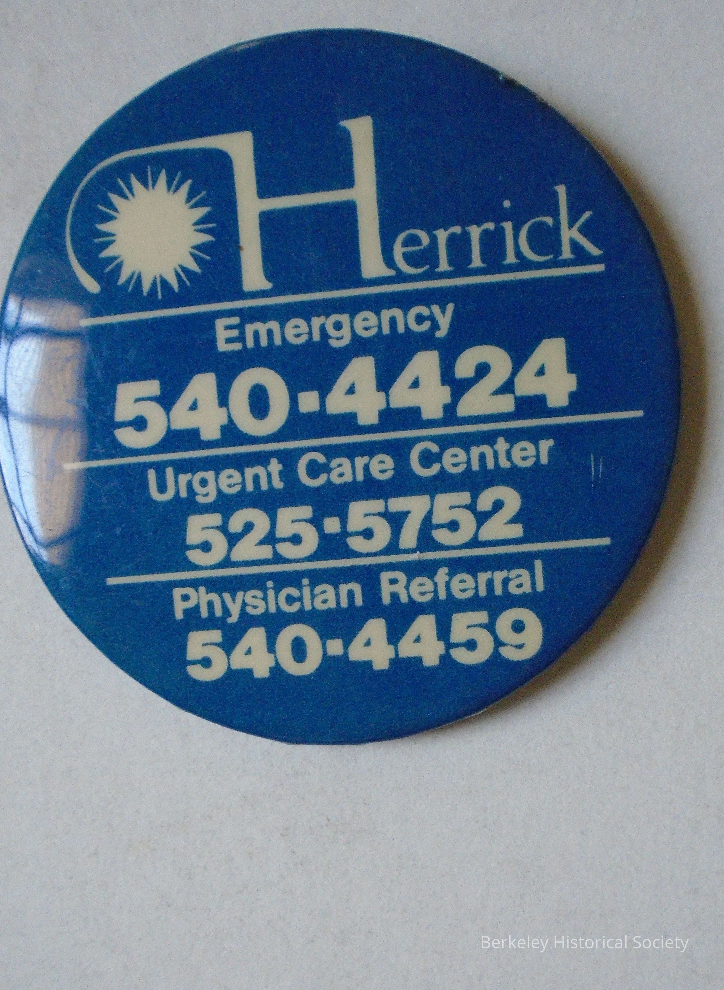Magnet advertising Herrick Hospital. Face is round, flat disk of paper covered with plastic and crimped into a metal backing. Paper is blue with white lettering: "Herrick, Emergency 540-4424, Urgent Care Center 525-5752, Physician Referral 540-4459". Round, flat magnet attached to back.Made/Created