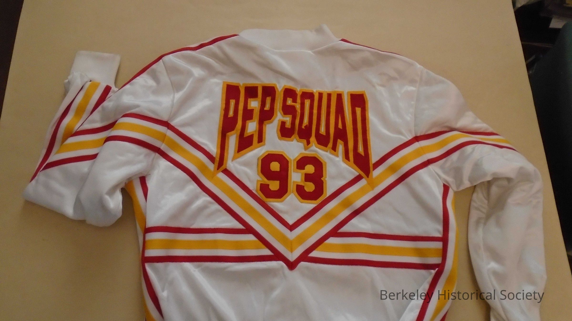 White, polyester baseball-style jacket with zip front. Decorated with red & gold striped braid, patch on front of "B" superimposed on a megaphone, patch on back "PEP SQUAD '93". Embroidered on front "Tanya". Label in neck : Teammates, 100% polyester, size L.Made/Created
