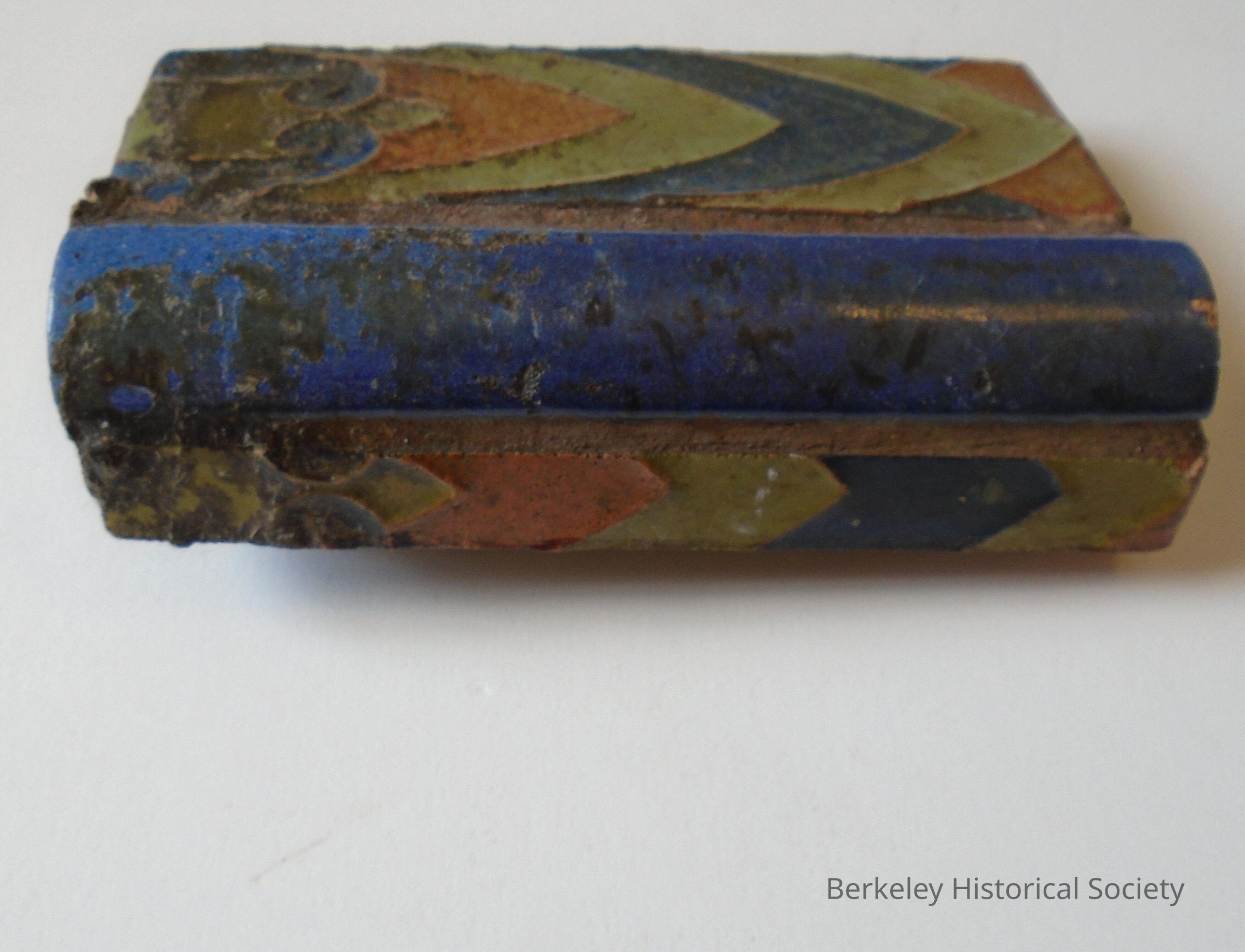 Portion of decorative, polychrome glazed tile in a blue, green and coral design. Tile is part of a molded baseboard on the main floor, and runs up stairwell to second floor, of the Veterans Memorial Bldg @ 1931 Center St. The landmarked building is an example of the Classic Moderne style. It was designed by Alameda County architect Henry H. Meyers and was completed in 1928.Made/Created