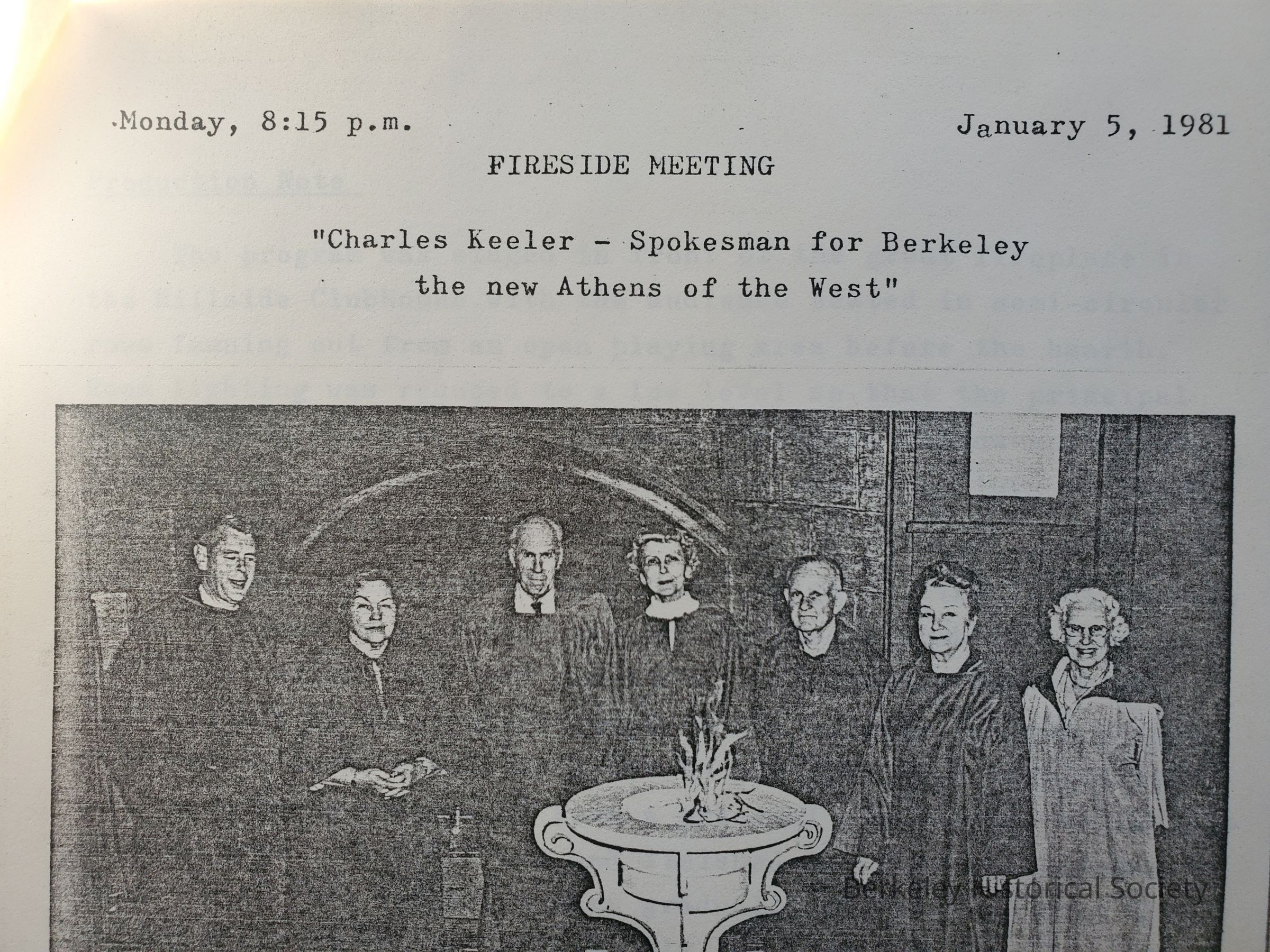2. Script for literary evening to be presented by a group of readers in front of the great fireplace at the Hillside Club: Charles Keeler - Spokesman for Berkeley in the new "Athens of the West." January 5, 1981. 20 l.