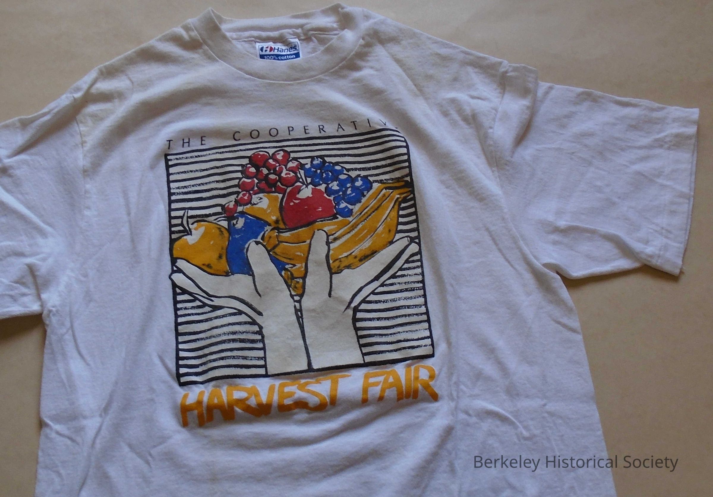 White, cotton, short sleeve t-shirt with design in front of 2 hands holding a fruit basket of misc. colors. Text reads "THE COOPERATIVE", "HARVEST FESTIVAL". Size: M (38-40). Hanes brand.